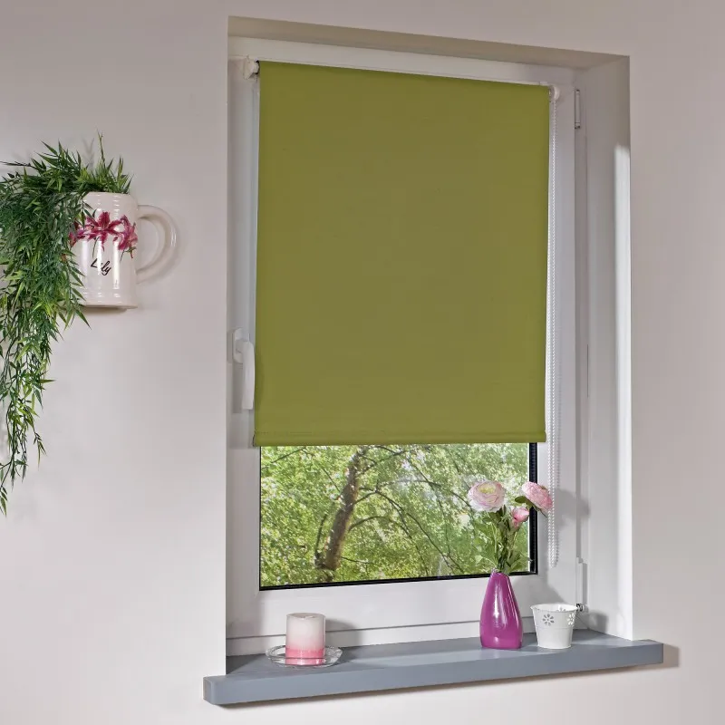 Das Rollo besteht aus verdunkelndem Stoff aus 100% Polyester und verfügt über eine Endloskugelkette zur stufenlosen Höhenverstellung. Die Befestigung erfolgt direkt am Fensterflügel mittels beiliegender Klemmträger, sodass keine Bohrungen erforderlich sind. Lieferumfang umfasst das Rollo mit Qualitätsseitenzug, Klemmträger, Befestigungsmaterial sowie eine Montage- und Bedienungsanleitung. Die Konstruktion zeigt eine Gesamtbreite inklusive Träger sowie eine definierte Auszugslänge; der Stoff ist etwas schmaler bemessen als die Gesamtbreite, um einen sauberen Sitz zu gewährleisten.