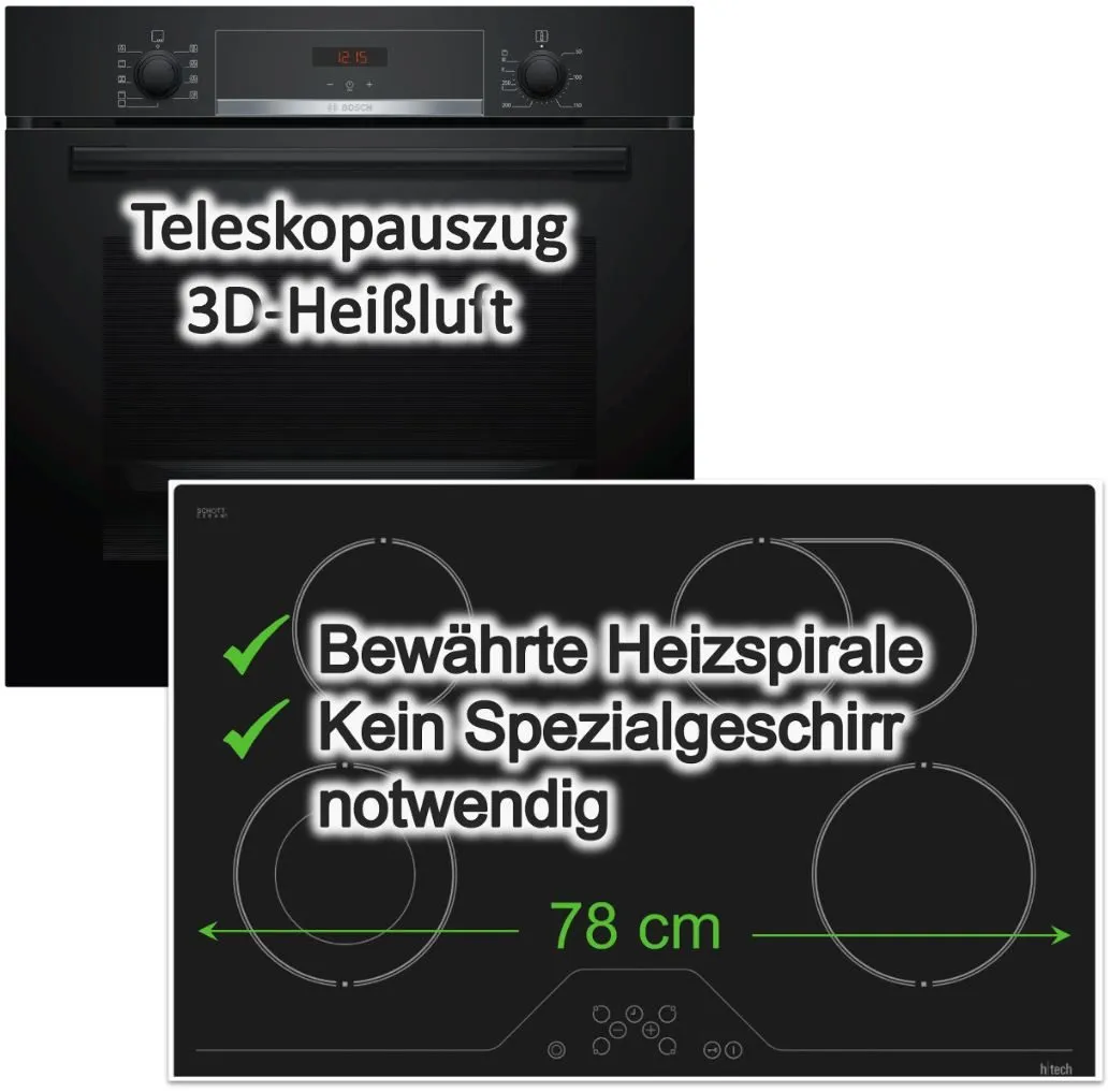 Das Set besteht aus einem Einbau-Backofen mit Hydrolyse-Reinigung und einem autarken, rahmenlosen Glaskeramikkochfeld. Der Backofen bietet ein großes Innenvolumen, mehrere Einschubebenen sowie vielfältige Beheizungsarten einschließlich 3D-Heißluft, Pizzafunktion und Grillfunktionen. Die Reinigung wird durch Hydrolyse und eine EcoClean-Emailbeschichtung unterstützt. Das Kochfeld verfügt über vier Zonen mit Zweikreis- und Bräterzone, Touchcontrol-Bedienung und neun Leistungsstufen sowie Restwärmeanzeige. Sicherheitsfunktionen wie Kindersicherung, Timer und Schnellaufheizfunktion sind integriert, und ein 1-fach Teleskopauszug erleichtert das Herausziehen von Backblechen.