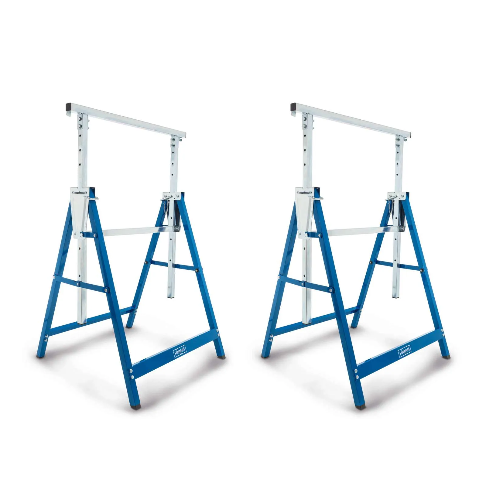 Die Ausführung besteht aus hochbelastbarem Stahl und bietet eine kompakte, klappbare Konstruktion für einfachen Transport und platzsparende Lagerung. Die Höhe ist in sieben Stufen verstellbar, wobei die Einstellbereiche eine fein abgestufte Anpassung erlauben. Verstellbare Anschlagswinkel verhindern seitliches Abrutschen von Arbeitsplatten oder Werkstücken, und rutschfeste Füße erhöhen die Standfestigkeit auf unterschiedlichen Untergründen. Die Auflagebalken haben eine nutzbare Länge von 680 mm und eignen sich auch für breitere Werkstücke. Im Lieferumfang sind zwei gleichwertige Teleskop-Arbeitsböcke enthalten, jeweils mit geringem Eigengewicht für komfortables Handling.