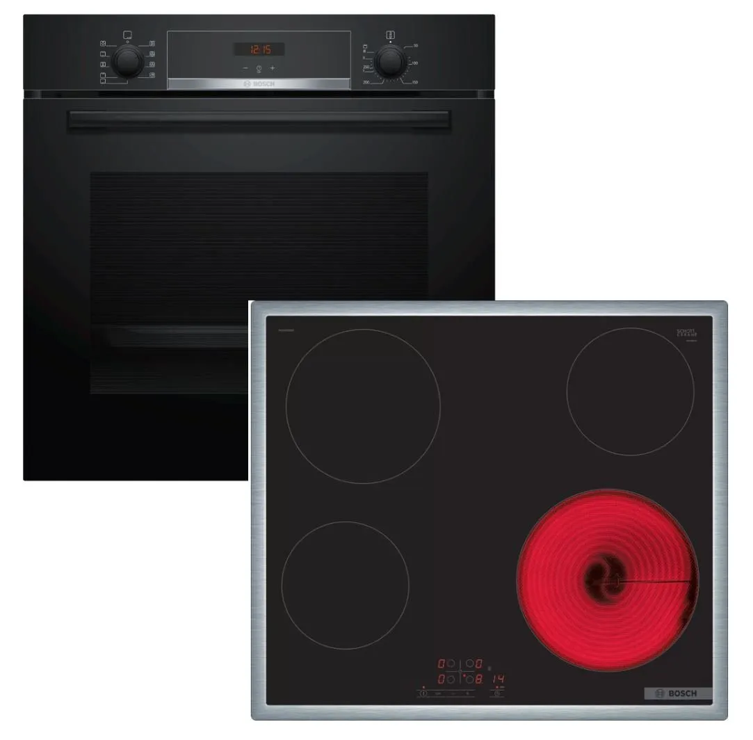 Das Set enthält einen autarken Einbau-Backofen mit umfangreicher Ausstattung sowie ein separates autarkes Glaskeramik-Kochfeld mit Edelstahlrahmen. Der Backofen verfügt über einen 71 Liter großen Garraum, sieben Beheizungsarten einschließlich 3D-Heißluft und Pizzafunktion sowie Reinigungsunterstützung durch EcoClean und Hydrolyse. Die Tür ist dreifach verglast und die Gerätetür wurde mit CoolDoor-Technologie ausgeführt; zur Ausstattung gehören Kombirost, emailliertes Universal-Backblech und ein einläufiger Teleskopauszug. Das Kochfeld bietet eine glatte Glasoberfläche mit TouchControl, vier gleichzeitigen Kochzonen, 17 Leistungsstufen, verschiedene Timerfunktionen sowie Sicherheitsmerkmale wie Kindersicherung, Restwärmeanzeige, ReStart und QuickStop. Beide Geräte enthalten detaillierte Installations- und Anschlussangaben sowie technische Leistungsdaten zur Planung des Einbaus.