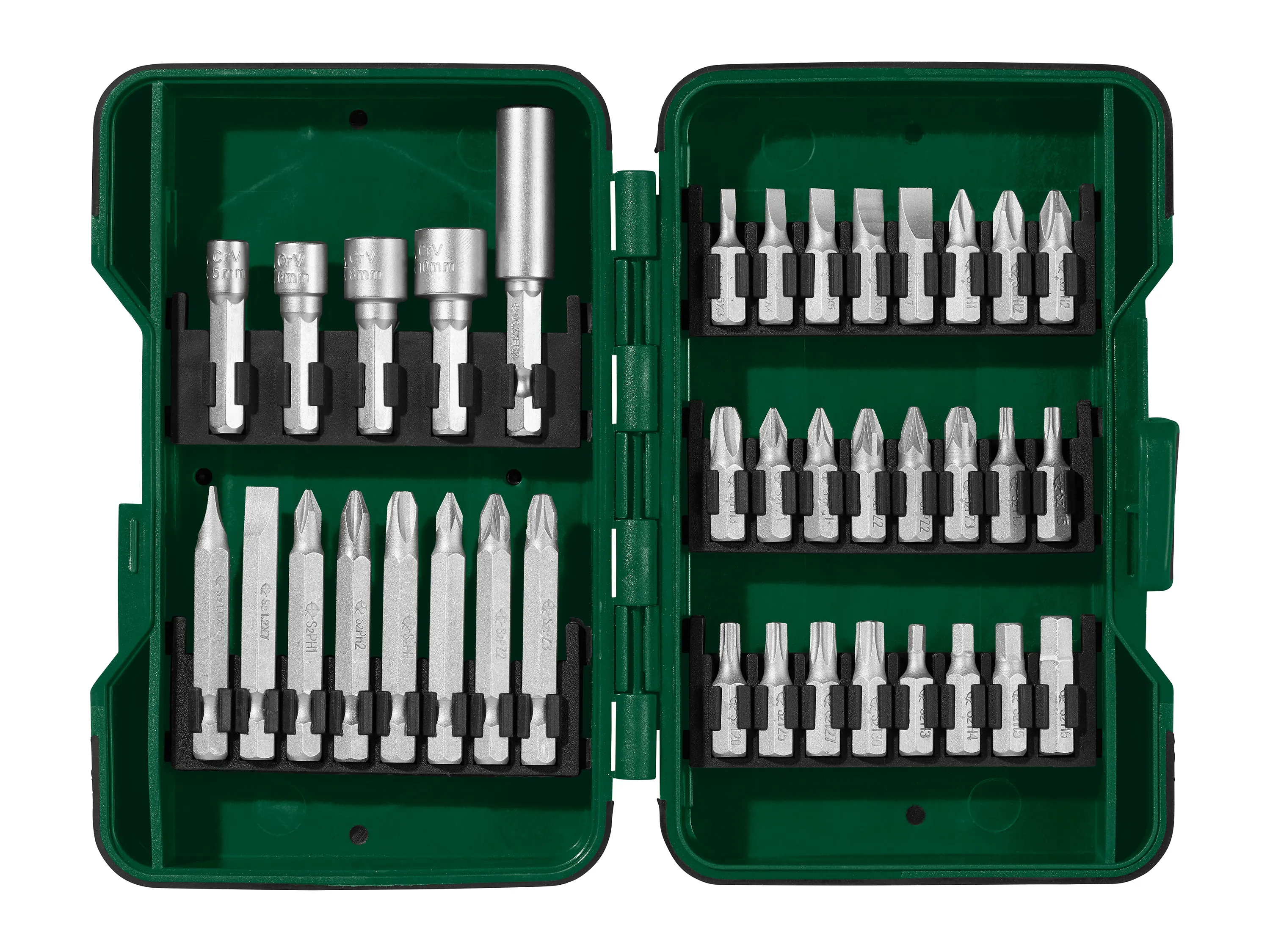 Das Set wird in einer sortierten Kunststoffbox mit Einrastverschluss geliefert und enthält mehrere separate Bohrer- und Bit-Sätze sowie einen magnetischen Bithalter. Die einzelnen Komponenten bestehen überwiegend aus Stahl und Kunststoff, die Holz- und Steinbohrer aus Karbonstahl mit präziser Zentrierspitze bzw. mit Hartmetallspitzen, die HSS-Bohrer sind mit einer Titanbeschichtung versehen. Die Bits sind in unterschiedlichen Längen und Ausführungen enthalten, einschließlich Stecknüssen und langen Bits; die Abmessungen der Box sowie die Gewichte der einzelnen Teilsätze sind angegeben.