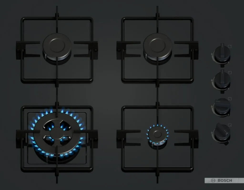 Das Gerät ist ein rahmenloses Gas-Kochfeld in schwarzer Ausführung mit vier Kochzonen und einem leistungsstarken Wok-Brenner. Die Bedienung erfolgt über rechts angeordnete Drehköpfe und die Einhandzündung ermöglicht eine einfache Zündung der Brenner. Zur Ausstattung gehören thermoelektronische Zündsicherung, Sicherheitsabschaltung und eine Nachwärmeanzeige sowie einzelne Topfträger aus Stahl mit Gummifüßen für erhöhte Standfestigkeit. Die Konstruktion umfasst kompakte Einbaumaße und ein übersichtliches Bedienfeld; das Gerät wird ohne Stecker geliefert und ist für den festen Anschluss vorgesehen.