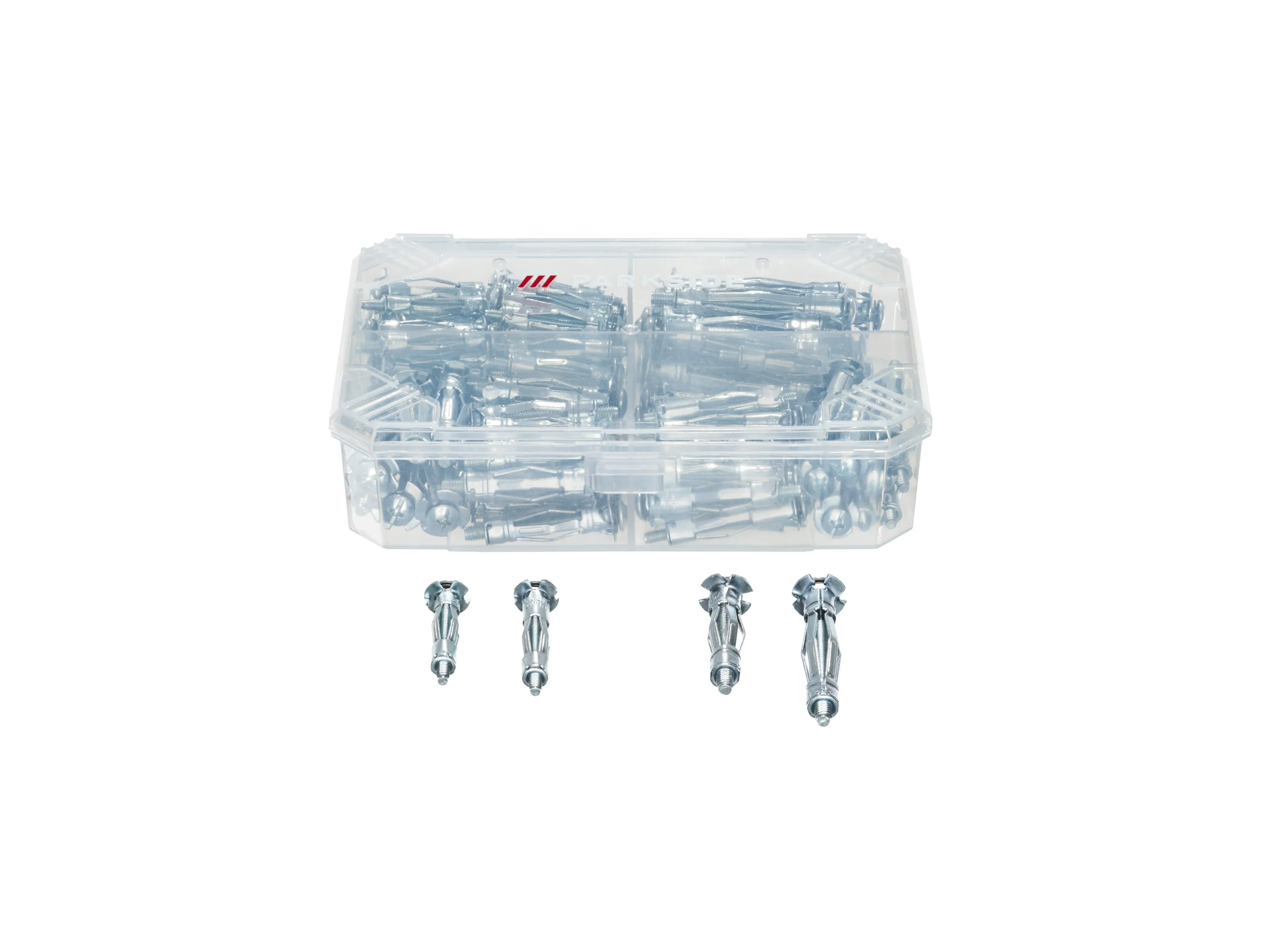 Das Set umfasst verschiedene Hohlraum- und Gipskartondübel sowie eine Verpresszange und ist aus Kunststoff und Stahl gefertigt. Die Ausführung enthält drei separate Zusammenstellungen mit unterschiedlichen Dübelgrößen und Stückzahlen sowie vorinstallierten Schrauben bei den Hohlraum-Metalldübeln. Angaben zu maximalen Traglasten und zulässigen Wanddicken sind für die jeweiligen Dübeltypen ausgewiesen. Die Oberflächen und Materialien sind auf einfache Handhabung und dauerhafte Befestigung ausgelegt. Lieferumfang und Gewichte der einzelnen Teilsets sind separat aufgeführt.