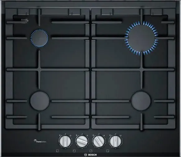 Das Gas-Kochfeld bietet eine Glaskeramik-Oberfläche mit vier Kochzonen und neun Leistungsstufen zur präzisen Temperaturregelung. Die Bedienung erfolgt über Schwertknebel mit FlameSelect® Plug & Play, die eine abgestufte Einstellung der Flammen ermöglichen. Zur Sicherheit ist eine thermoelektrische Zündsicherung integriert, die den Gasfluss bei Erlöschen der Flamme unterbricht. Spülmaschinenfeste Topfträger erleichtern die Reinigung, während das kompakte Gehäuse mit geringem Aufbauvolumen ausgeführt ist. Technische Anschlusswerte und Einbaumaße sind angegeben, ein fachgerechter Anschluss durch Elektrofachpersonal ist erforderlich.
