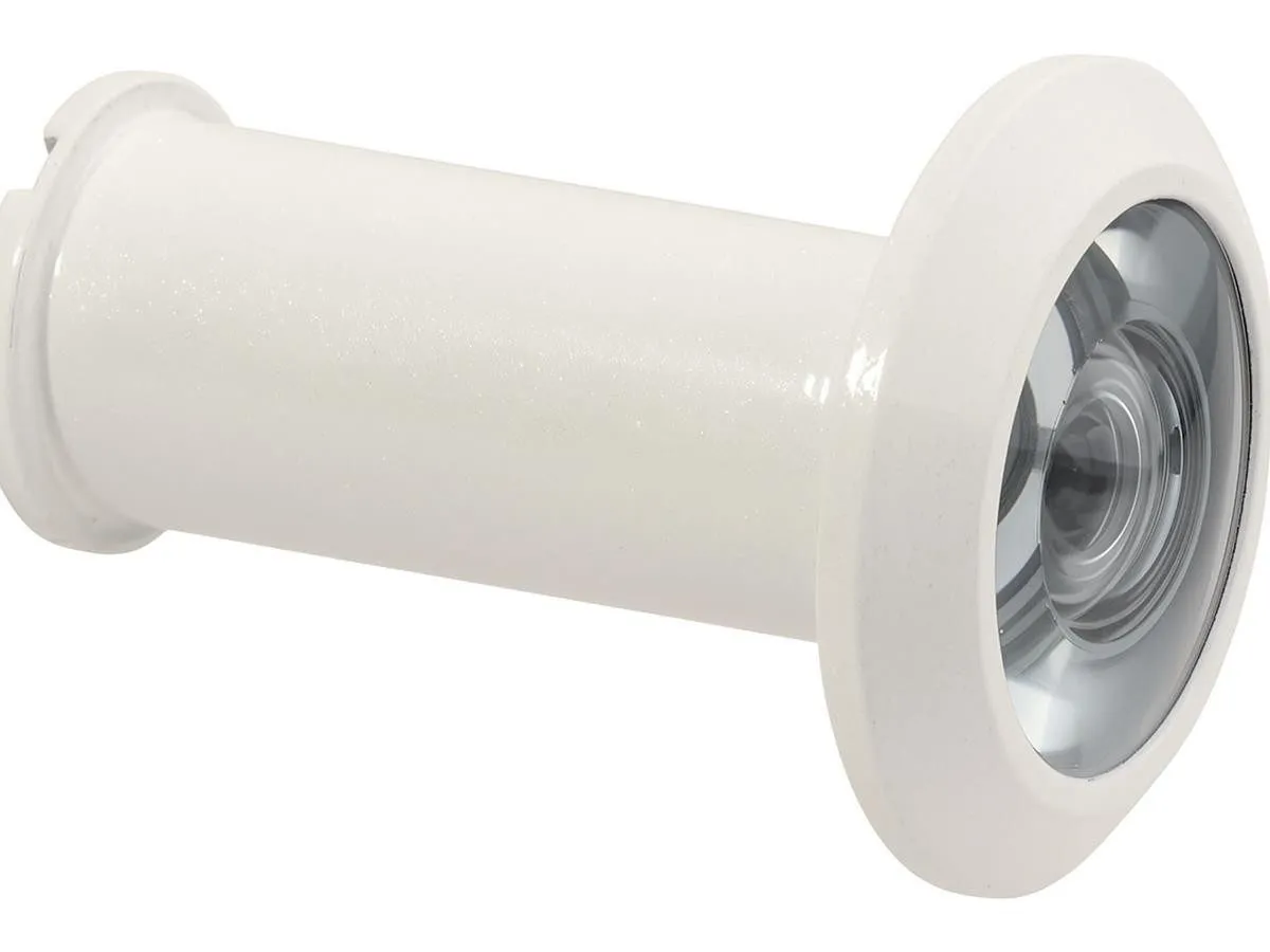 Der Türspion ist in Weiß ausgeführt und verfügt über eine Weitwinkeloptik mit einem Blickfeld von etwa 180°. Die Konstruktion ist für Türstärken von 35 bis 106 mm geeignet und wird mit einem Sichtschutzblech sowie drei Verlängerungsstücken geliefert, um verschiedene Türdicken abzudecken. Die Ausführung umfasst die notwendige Hardware zur Montage und ist so gestaltet, dass die optischen Komponenten bündig in der Türinnenseite abschließen. Materialangaben sind nicht näher spezifiziert; die Komponenten sind auf einfache Nachrüstung und variierende Türdicken ausgelegt.