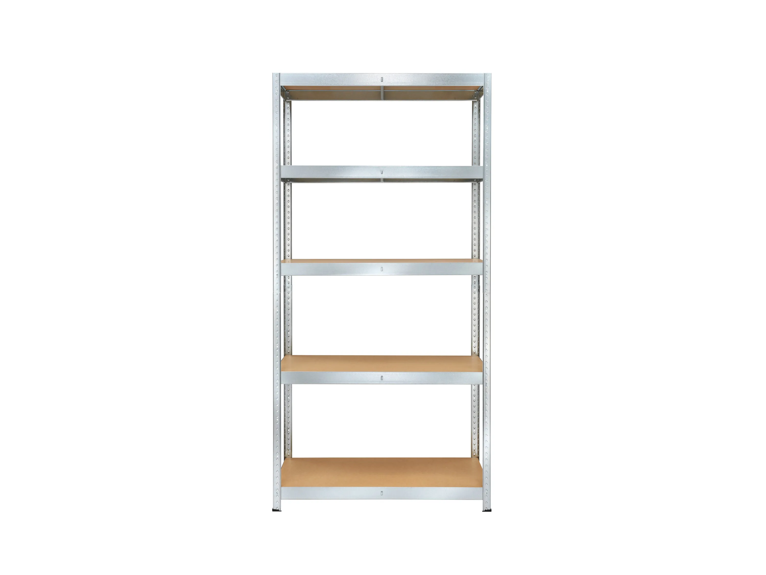 Das Regal besteht aus verzinktem Stahl und ist mit HDF-Böden ausgestattet. Die Konstruktion verfügt über fünf höhenverstellbare Böden und ein einfaches Stecksystem, das den Aufbau ohne Schrauben erleichtert. Das Regal kann sowohl vertikal als auch horizontal aufgebaut werden und weist eine robuste Fertigung für schwere Lasten auf. Im Lieferumfang sind Winkelprofile, Verbinder, Schutzkappen und eine Montageanleitung enthalten, die die Montage schrittweise erläutern. Die Oberfläche ist korrosionsbeständig verzinkt, die Böden sind formstabil ausgeführt, und die Konstruktion bietet eine hohe Standfestigkeit.