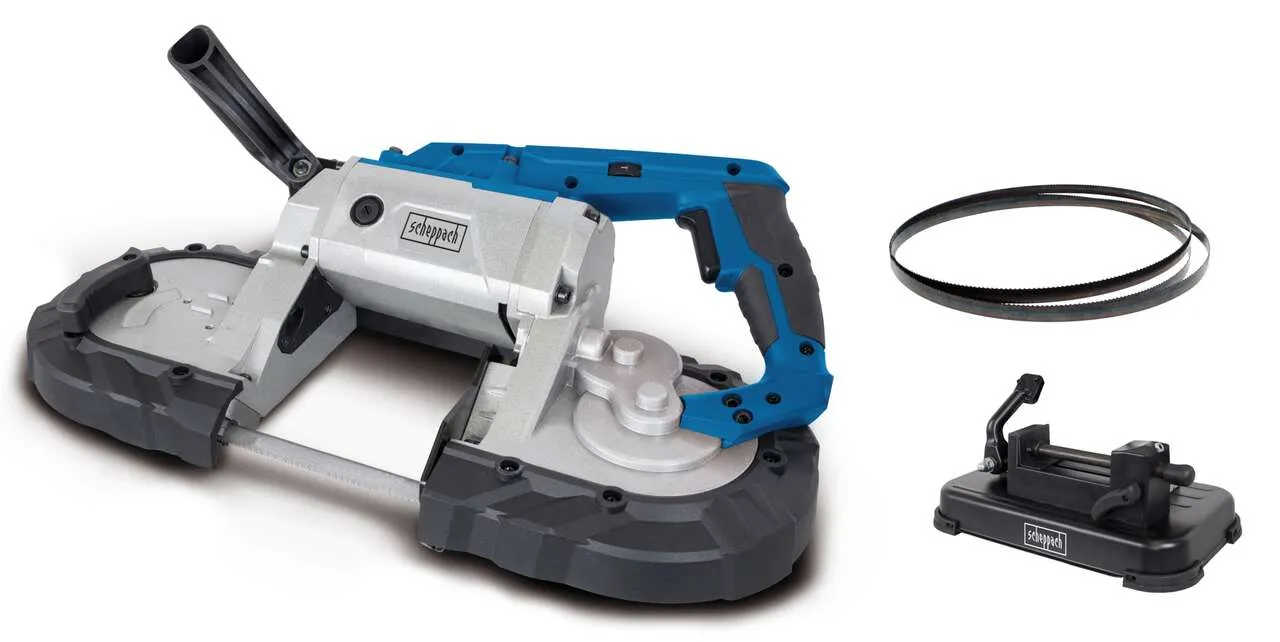 Das Gerät ist als Metallbandsäge ausgeführt und verfügt über eine robuste Konstruktion mit werkseitig montiertem Arbeitstisch und freihändiger Einsatzmöglichkeit. Der Maschinenkopf lässt sich von 0° bis 45° neigen und ist mit einer Skala sowie einem arretierbaren Bolzen zur Winkeleinstellung ausgestattet. Zwei isolierte Handgriffe, davon ein verstellbarer Vordergriff, sorgen für sichere Handhabung bei Freihandeinsätzen. Die Arbeitsgeschwindigkeit ist stufenlos über ein Drehzahlstellrad einstellbar, die Beleuchtung des Schnittbereichs erfolgt über eine integrierte LED-Lampe. Im Lieferumfang sind ein vormontiertes Sägeband sowie ein zweites Sägeband, ein Arbeitstisch und die notwendigen Bedienelemente enthalten.
