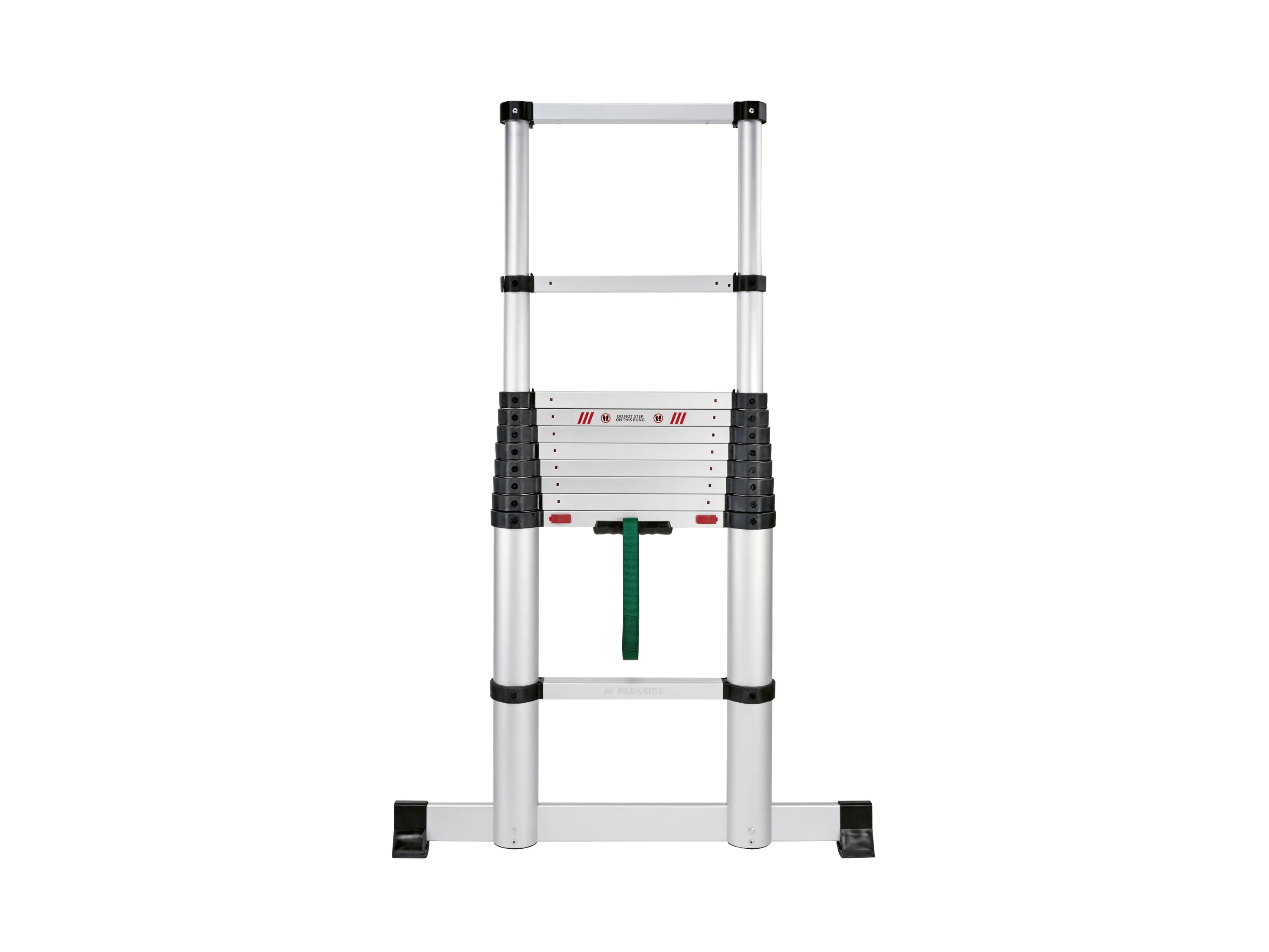 Die Alu-Teleskopleiter ist aus Aluminium gefertigt und zeichnet sich durch eine stabile, standfeste Konstruktion mit rutschsicheren Stufen aus. Ein Soft-Close-Mechanismus sorgt für kontrolliertes Einfahren der Teleskopsektionen, während Antirutschfüße und gummierter Wandstoßschutz die Standfestigkeit und die Wandauflage verbessern. Die Leiter ist platzsparend zusammenklappbar und wird mit einem Verschlussriemen geliefert, der das Transportieren und Verstauen erleichtert. Technische Prüfungen nach EN131 bestätigen die normgerechte Ausführung. Abmessungen, Tragfähigkeit und das geringe Gewicht ermöglichen eine einfache Handhabung und Lagerung.