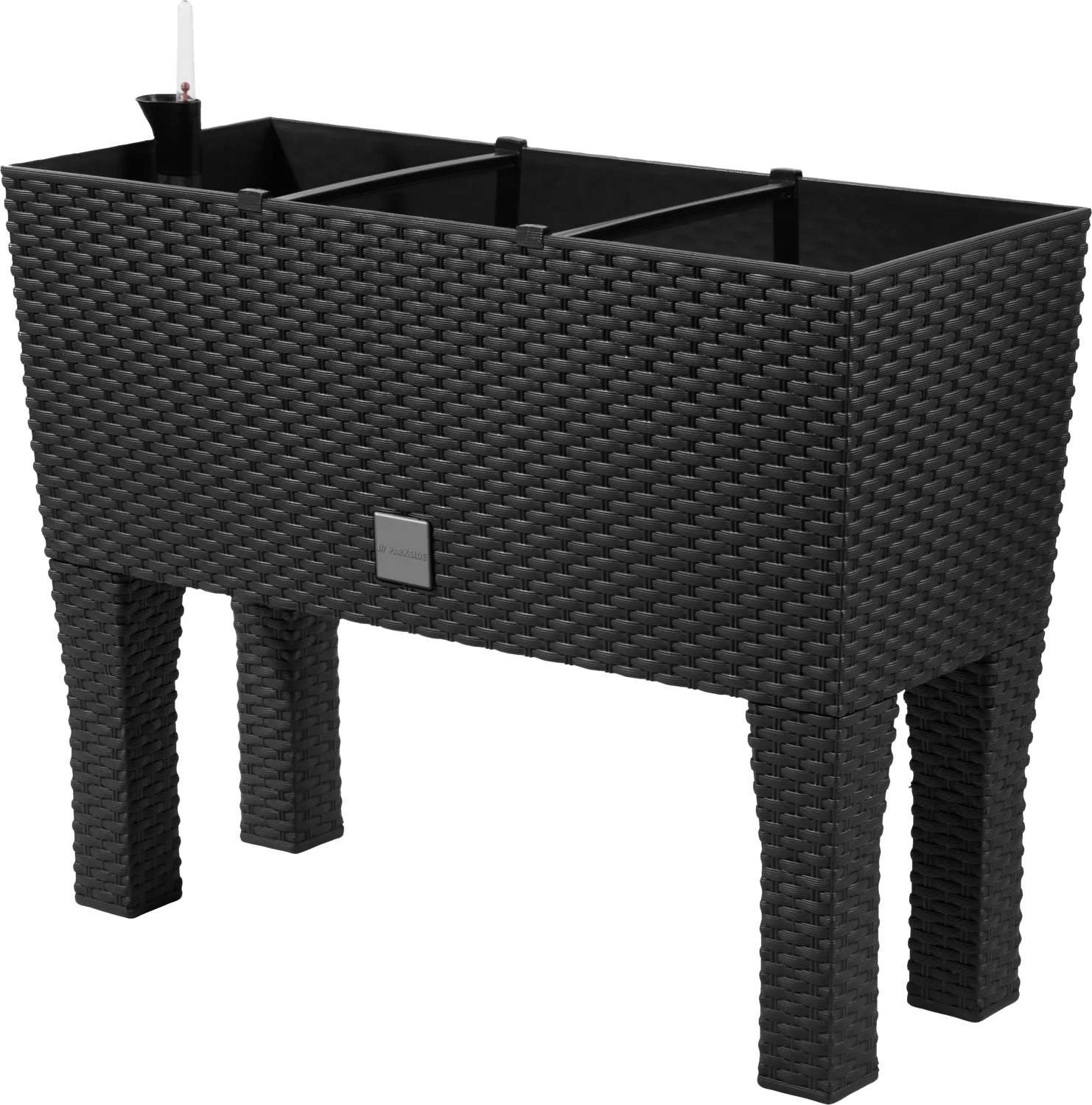 Die Konstruktion besteht aus Kunststoff in schwarzer Ausführung und verfügt über eine 2-in-1-Bauform mit unterschiedlichen oberen und unteren Abmessungen. Die Ausführung hat kein Deckel und ist mit einem Pflanzeinsatz sowie einem integrierten Bewässerungssystem mit Wasserstandsanzeige ausgestattet. Zum Lieferumfang gehören vier Füße, zwei Streben, Verschluss-Stopfen und eine Silber-Plakette. Die Verarbeitung ist auf eine leichte Handhabung und einen geringen Eigengewichtswert ausgelegt; alle relevanten Komponenten sind auf einfache Montage und Pflege abgestimmt.