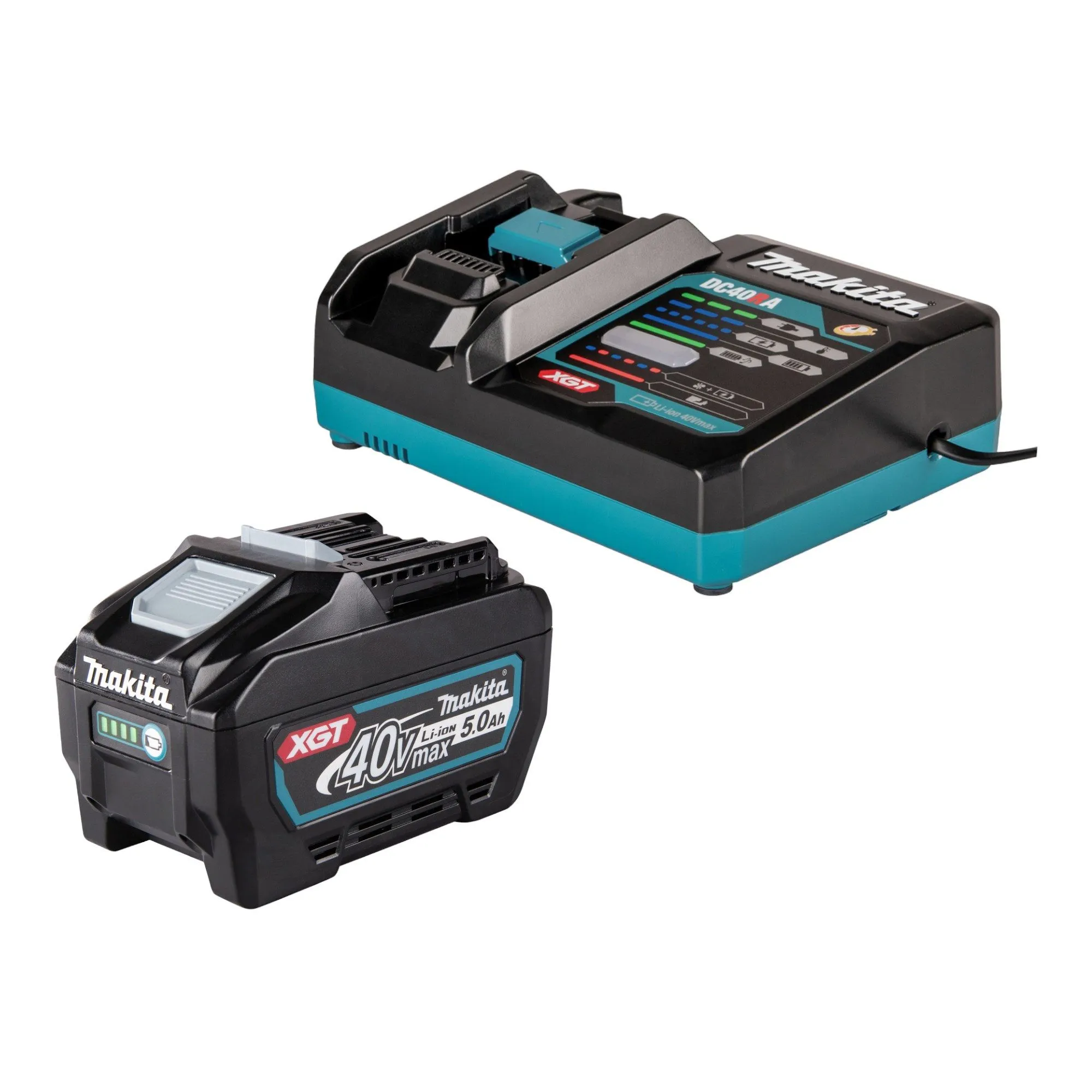 Das Set umfasst einen BL4050F Lithium-Ionen-Akku der XGT-Serie sowie ein DC40RA Schnellladegerät. Der Akku verfügt über eine Batterieladestandanzeige mit vier LEDs und einem Abfrageknopf, ein robustes gehäuse mit IP64-Schutz sowie drei innenliegende Schutzschichten zur erhöhten Sturzfestigkeit. Ein digitales Kommunikationssystem zwischen Akku und Maschine sowie ein aktives Kühlsystem sind integriert. Das Schnellladegerät arbeitet mit zwei Lüftern und bietet verschiedene einstellbare Melodietöne; Netzkabel und Abmessungen sind für den Einsatz auf Baustellen ausgelegt. Lieferumfang und technische Ausführung sind auf professionelle Anforderungen abgestimmt; alle relevanten Komponenten sind im Set enthalten.