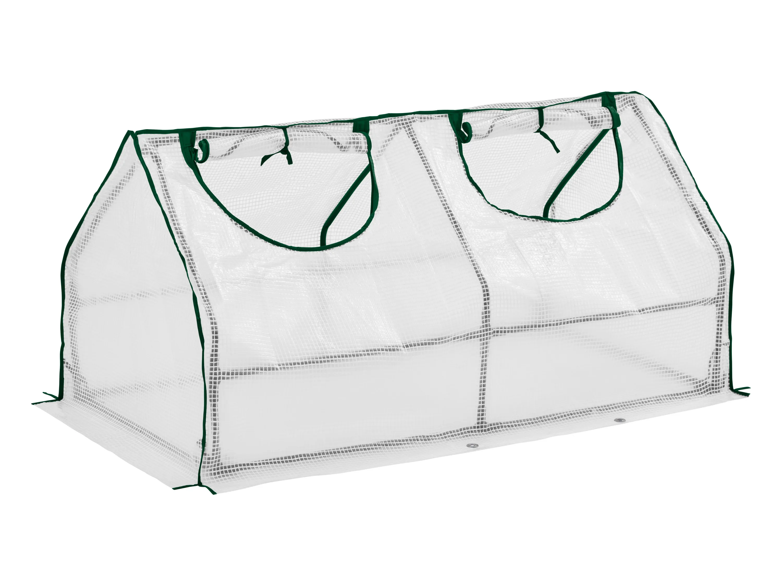 Das Frühbeet besteht aus einer halbtransparenten Gitterfolie aus reißfestem PE-Gewebe und einem stabilen Rahmen aus 13 mm Metallrohren. Die Konstruktion verfügt über einen überlappenden Bodenabschluss mit Ösen sowie Erdnägel zur sicheren Verankerung und ist laut Hersteller witterungs- und UV-beständig (EN 4892-3, 500h). Der Aufbau erfolgt werkzeuglos per Stecksystem mit Buchstabenmarkierungen. Zum Lieferumfang gehören aufrollbare Reißverschluss-Dachfenster mit Befestigungskordel sowie Erdnägel; das Set wird teilweise aus recyceltem Material gefertigt. Die Ausführung ist auch für die Nutzung auf Hochbeeten konstruiert.