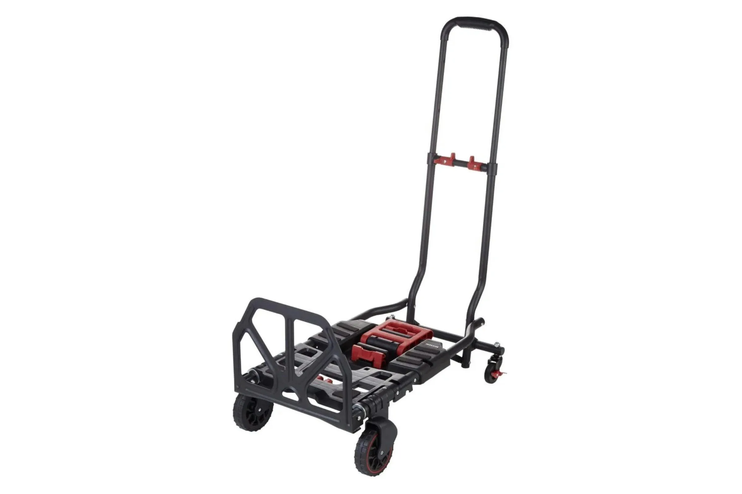 Das klappbare 2‑in‑1 System kombiniert eine Wagen- und eine Karrenfunktion in einer Konstruktion aus Stahl und Kunststoff. Die Ausführung verfügt über einen ausziehbaren Handgriff, kleine Rollen mit Feststellbremsen sowie elastische Fixierbänder zur Sicherung der Ladung. Das Klappsystem ermöglicht eine kompakte Unterbringung, die Ladeflächen sind jeweils unterschiedlich ausgeführt und auf den beiden Betriebsarten angepasst. Die Verarbeitung zeigt sichtbare Verstärkungen an tragenden Bauteilen, die Bodenauflagen sind so gestaltet, dass Ladung positioniert und befestigt werden kann. Im Lieferumfang sind zwei elastische Fixierbänder enthalten.