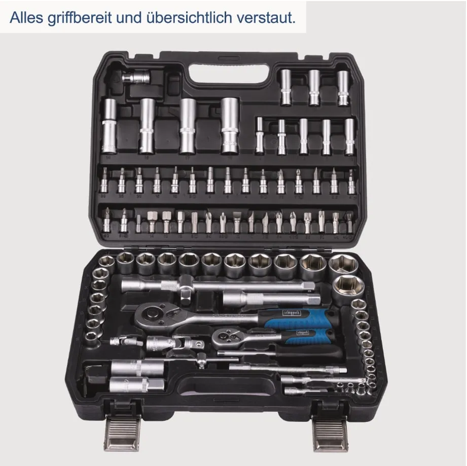 Das 94-teilige Steckschlüsselsatz-Set wird in einem stabilen Werkzeugkoffer geliefert und bietet eine übersichtliche Anordnung der Einzelteile. Die Zusammenstellung enthält verschiedene Steckschlüssel, Bits und Adapter in unterschiedlichen Größen, die platzsparend und sicher im Koffer fixiert sind. Die Ausführung legt Wert auf langlebige Materialien und eine robuste Verarbeitung der einzelnen Werkzeuge sowie auf eine einfache Entnahme und Rückführung in die Einsätze des Koffers.