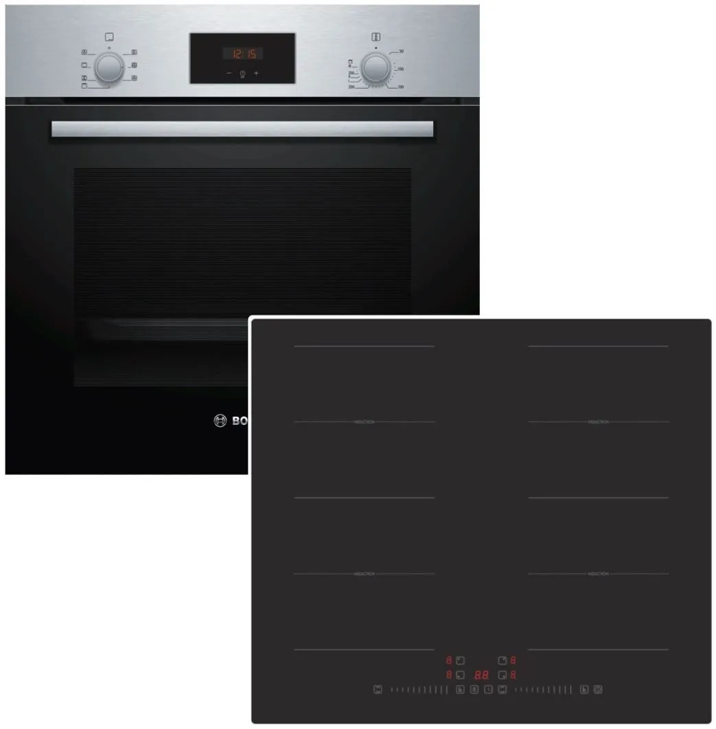 Das Set besteht aus einem Einbau-Backofen mit mehreren Beheizungsarten und einem autarken, rahmenlosen Induktionskochfeld mit Flexzonen. Der Backofen verfügt über 3D Heissluft, Heissluft sanft, Ober-/Unterhitze, Umluftgrill und einen variablen Grossflächengrill sowie eine EcoClean Direct-Rückwand und eine Vollglas-Innentür zur vereinfachten Reinigung. Das Kochfeld bietet vier Kochzonen, darunter zwei Doppel-Flexzonen, Touch-Control-Bedienung mit Sliderfunktion, Boosterfunktion, automatische Topferkennung und Restwärmeanzeige. Beide Geräte sind einzeln nutzbar, flächenbündig einbaubar und verfügen über Sicherheitsfunktionen wie Kindersicherung und Überhitzungsschutz. Zum Lieferumfang des Backofens gehören ein Kombirost und eine grossflächige Universalpfanne.