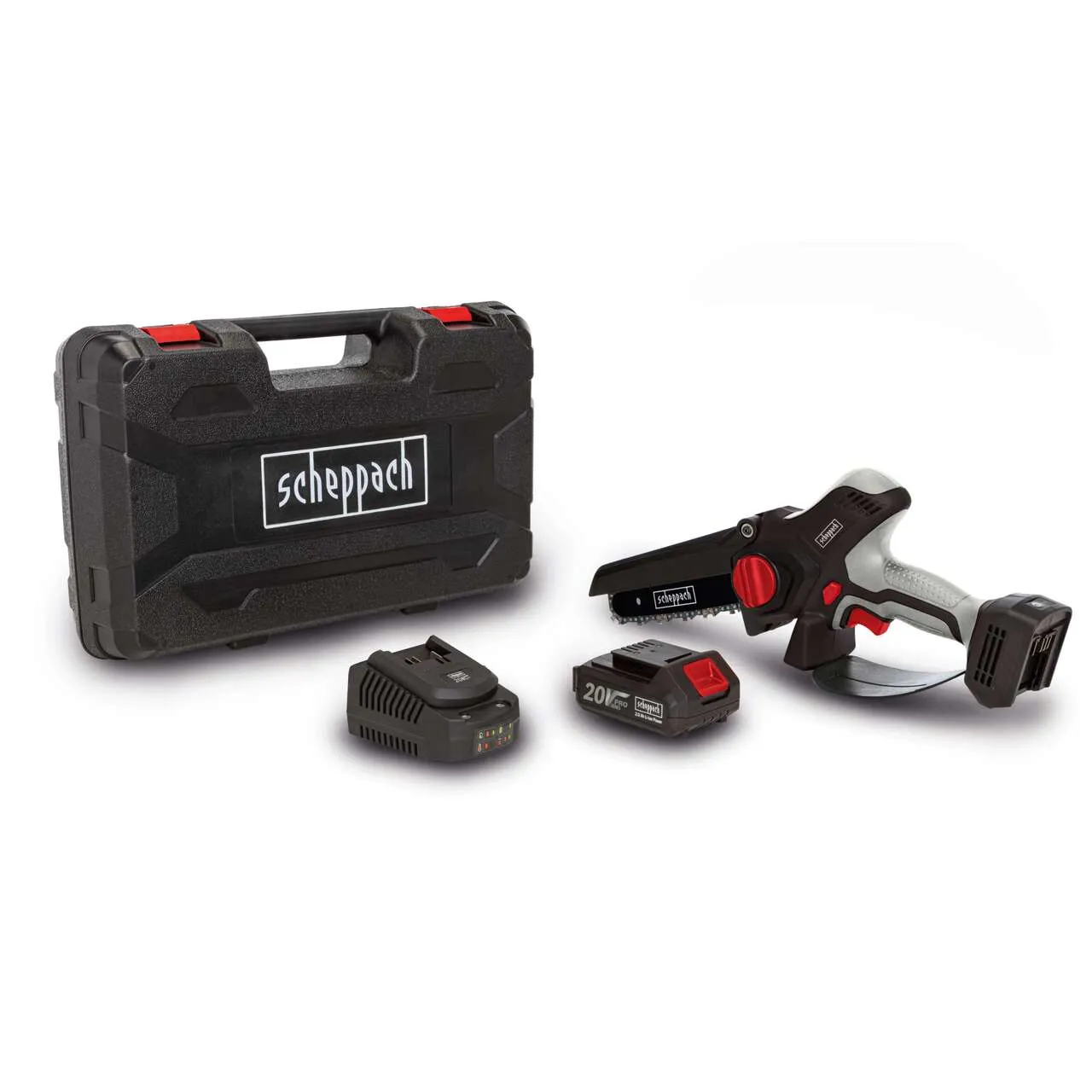 Der Akku-Gehölzschneider verfügt über ein kompaktes und leichtes Gehäuse sowie einen komfortablen Softgriff, der die Handhabung erleichtert. Ausgestattet ist das Gerät mit einem 6 Zoll Qualitätsschwert und einer Kette, die beidseitig eingesetzt werden kann, sowie mit automatischer Kettenspannung und automatischer Kettenschmierung. Der bürstenlose Motor arbeitet mit einer Nennspannung von 20 Volt und erzielt eine maximale Schnittgeschwindigkeit von 6,8 m/s bei einer maximalen Schnittlänge von 150 mm. Sicherheitsmerkmale umfassen einen integrierten Handschutz und Kettenschutz; im Lieferumfang sind ein Ladegerät, ein 20 V / 2 Ah Akku und ein Transportkoffer enthalten. Mit einem Gewicht von 1,7 kg ist das Gerät für längere Einsätze ausgelegt.