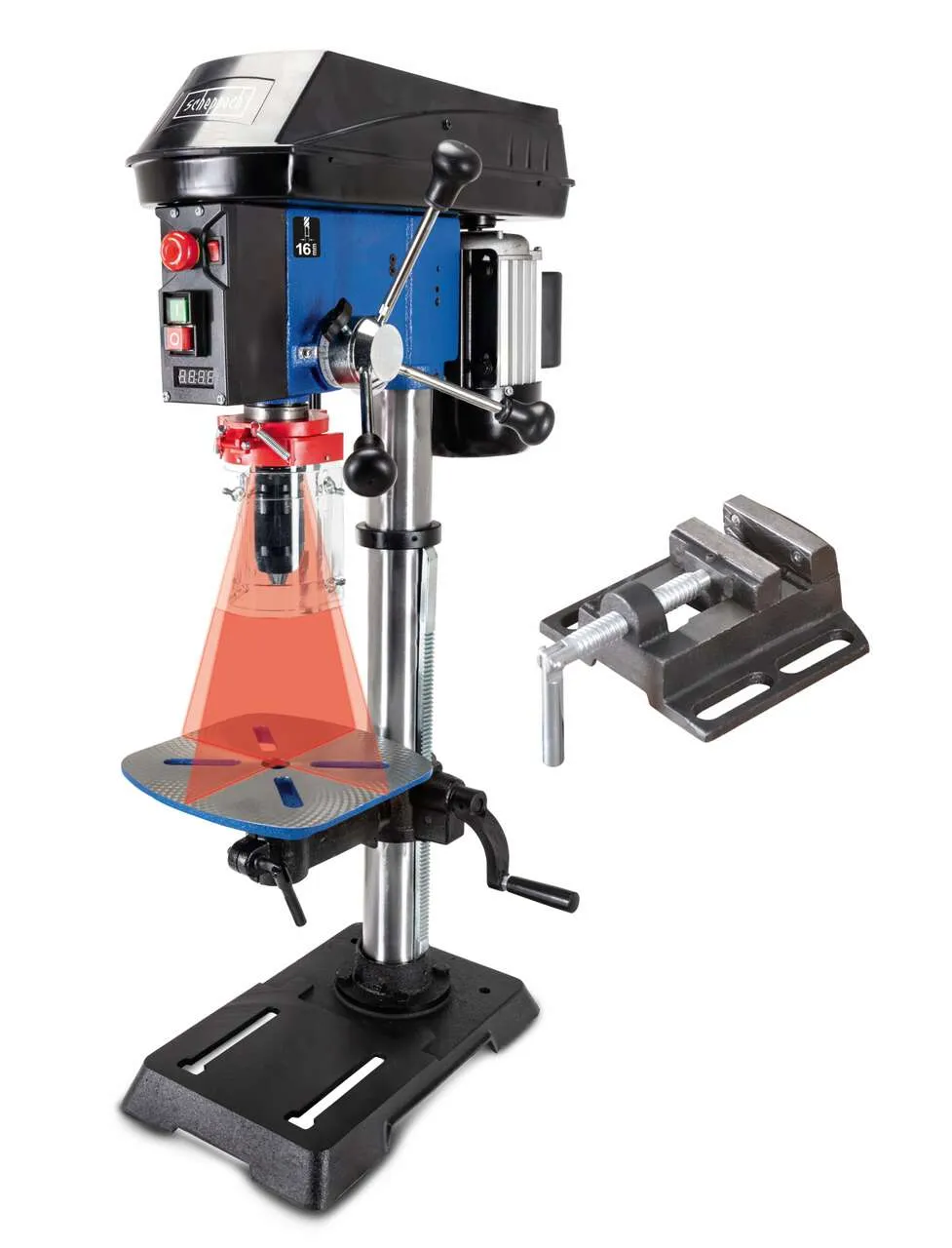 Die Tischbohrmaschine verfügt über eine robuste Gusseisen-Konstruktion und präsentiert sich in einer stabilen Ausführung mit integrierter Tischverbreiterung und Auflagerolle. Die stufenlose Drehzahlregelung lässt sich werkzeuglos über einen Handgriff einstellen und ermöglicht einen Drehzahlbereich von 440 bis 2580 min-1. Serienmäßig sind ein Schnellspann-Bohrfutter, ein Positionslaser sowie ein LED-Arbeitslicht verbaut. Das Gerät ist für Bearbeitungen in Holz, Metall und Kunststoff vorgesehen und wird durch einen 550 Watt starken Motor angetrieben. Alle Bedienelemente und Zusatzausstattungen sind auf eine komfortable und präzise Bedienung ausgelegt.