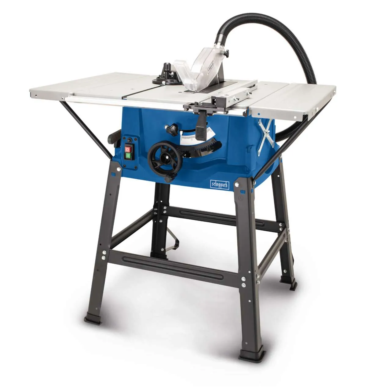 Die Tischkreissäge verfügt über ein kompaktes, auf einem stabilen Untergestell montiertes Gehäuse mit rutschfesten Gummifüßen und einer Arbeitshöhe von 830 mm. Der Sägetisch hat Abmessungen von 642 x 485 mm und lässt sich durch links und rechts ansetzbare Tischverbreiterungen für größere Werkstücke erweitern. Die Maschine besitzt eine Höhen- und Schrägverstellung mittels Handrad sowie eine Skala mit integrierter Lupe; ferner sind Sägeblattschutz, Längsanschlag mit Schnellspannhebel, Querschneidlehre und Absauganschlüsse ober- und unterhalb des Blatts serienmäßig vorhanden. Das Gerät wiegt rund 20 kg und ist für präzise Längs- und Winkelschnitte mit einstellbarer Winkellage und exakten Anschlagselementen ausgelegt.