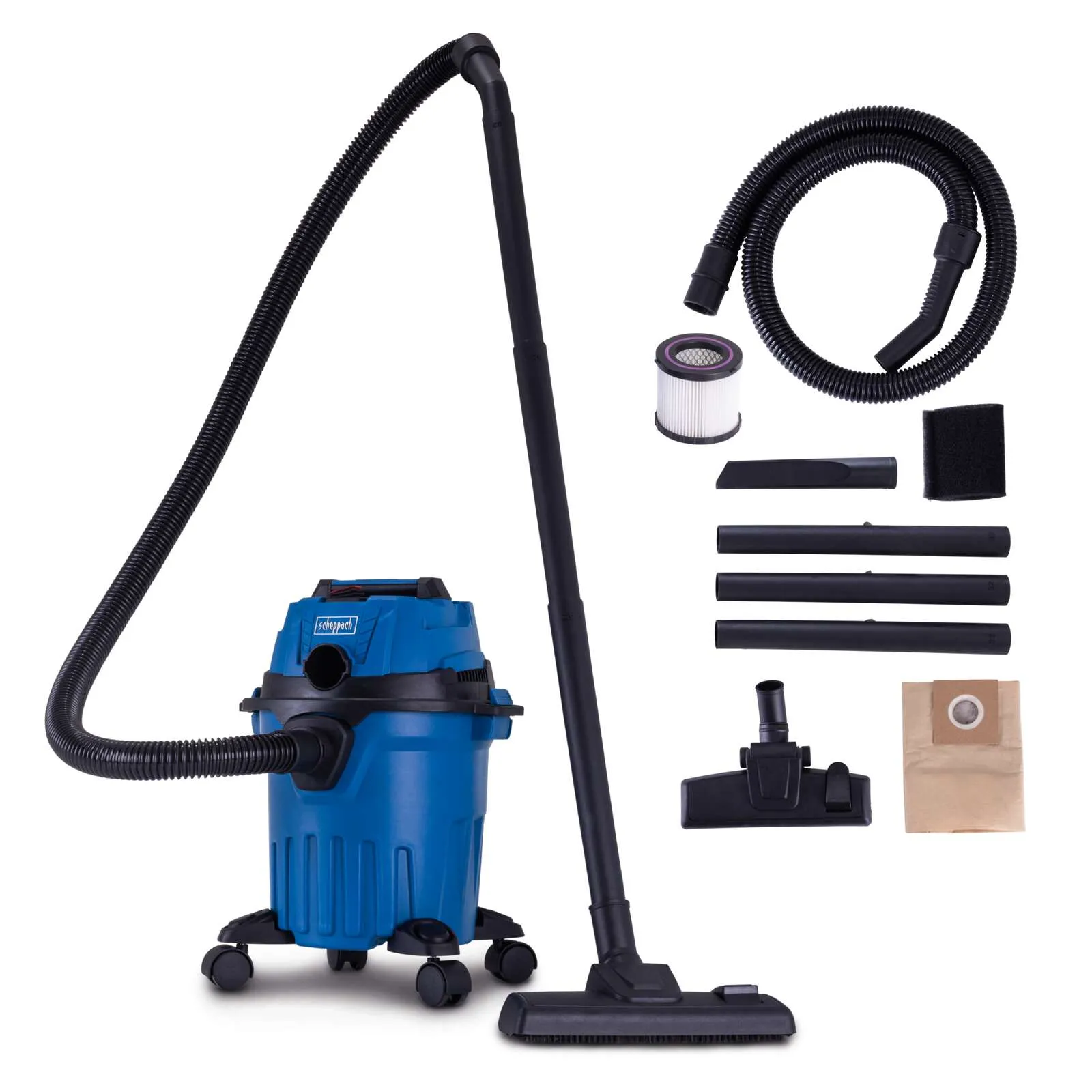 Das kompakte Gerät verfügt über einen bruchsicheren Auffangbehälter mit Schnellspannverschluss und einem Volumen von 12 Litern, wodurch längere Arbeitsintervalle ermöglicht werden. Zur Filtration gehören ein waschbarer Faltenfilter und ein zusätzlicher Schaumstofffilter; die Ausstattung umfasst zudem einen Papierbeutel (FSC-zertifiziert). Der Sauger bietet eine Ausblasfunktion, einen 1,5 m Saugschlauch mit drei Kunststoff-Verlängerungsrohren sowie eine praktische Zubehörhalterung für Bodendüse und Fugendüse. Vier leichtgängige 360°-Rollen und ein integrierter Handgriff sorgen für einfache Mobilität; das Gerät ist mit dem Scheppach IXES 20‑Volt-System kompatibel und lässt sich somit kabellos betreiben.