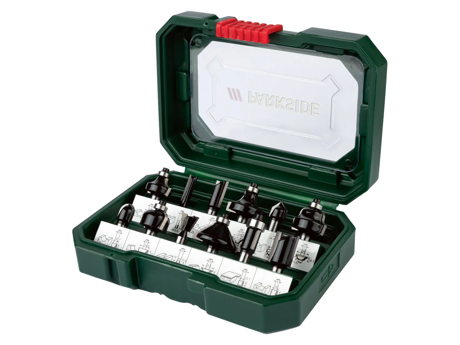 Das Set enthält zwölf Fräsbits zur Verwendung in Oberfräsen und ist speziell auf gängige Holzmaterialien abgestimmt. Sechs der Fräser sind mit einem kugelgelagerten Anlaufring ausgestattet, alle Schneiden bestehen aus langlebigem Hartmetall. Die Bits sind für Werkzeugaufnahmen mit 8 mm ausgelegt; zum Lieferumfang gehört ein Innensechskantschlüssel. Materialangaben der Einzelteile umfassen Stahl, Kupfer und Kunststoff. Das Set ist kompakt verpackt und weist eine Gesamtgröße von etwa 17,5 x 12 x 5,5 cm sowie ein Gesamtgewicht von ca. 518 g auf.
