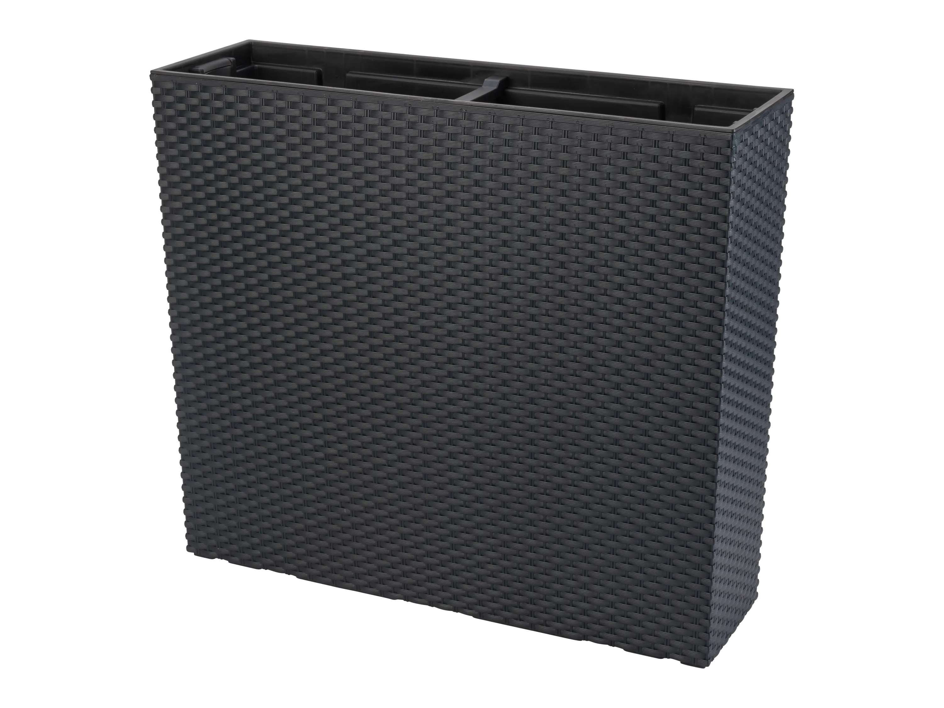 Der Raumteiler-Pflanzkasten ist in einer dekorativen Rattan-Geflecht-Optik ausgeführt und besteht überwiegend aus Kunststoff. Der Einsatz ist herausnehmbar und verfügt über integrierte Henkel zur vereinfachten Entnahme der Bepflanzung. Zur Entwässerung ist ein Verschluss-Stopfen vorhanden; die Ausführung ist witterungs- und UV-beständig, sodass die Oberfläche langlebig bleibt. Das Produkt wird inklusive Pflanzeinsatz mit Henkeln, Untersetzer-Einsatz, Strebe, Stabilisator Vertikal, Verschluss-Stopfen und einer silbernen Plakette geliefert. Die kompakte Bauform mit unterschiedlichen oberen und unteren Abmessungen sorgt für Standfestigkeit.