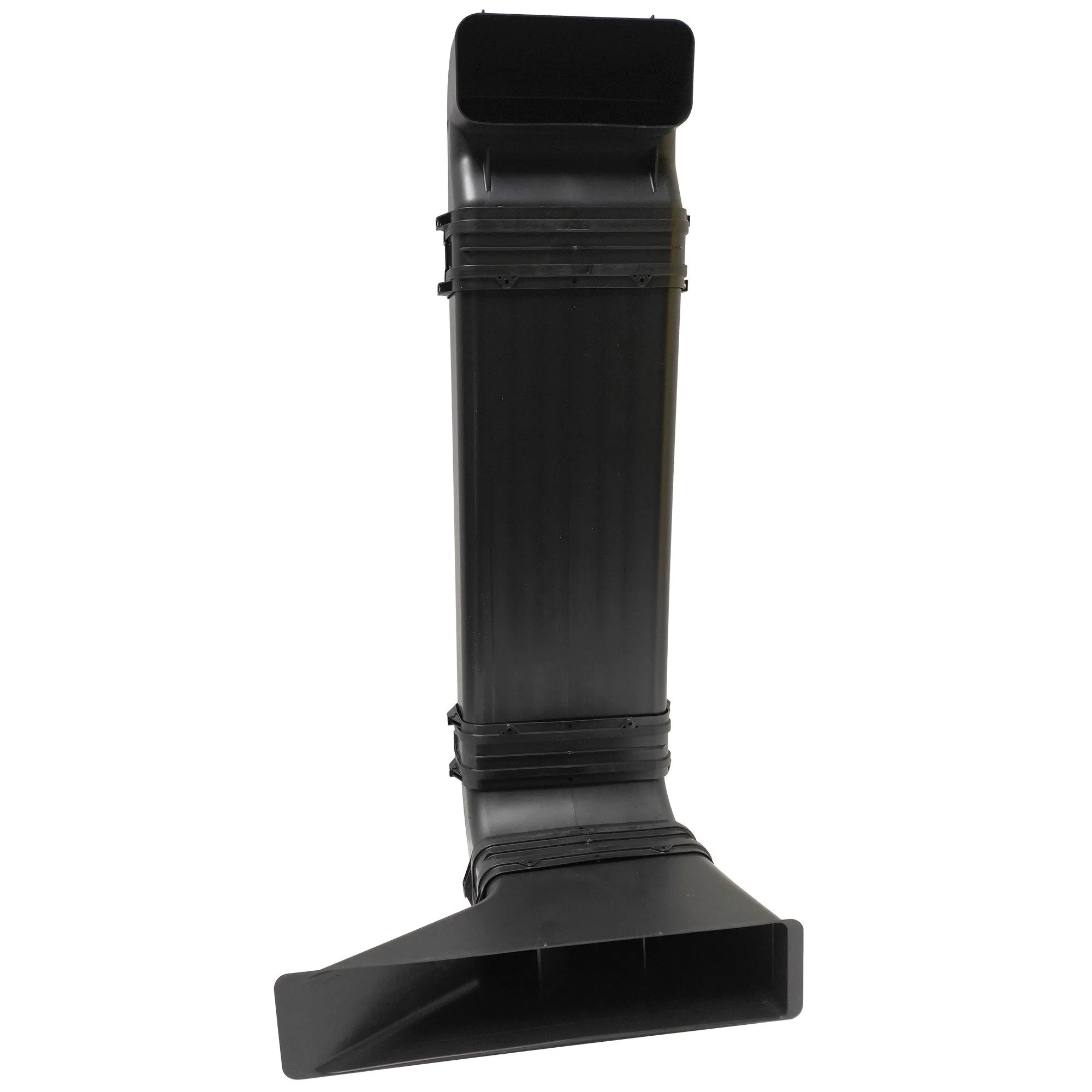Das Umluftset besteht aus mehreren Flachkanalelementen, darunter vertikale 90° Bögen mit Außengewinde, Verbindungsmuffen zur Verbindung männlicher Flachkanalelemente sowie einem geraden Rohrelement mit 500 mm Länge. Ein Diffusorelement ist ebenfalls enthalten, das direkt an die Flachkanalelemente angeschlossen wird und die Luft im Sockelbereich verteilt. Die Komponenten sind für den Einbau in Arbeitsplattenhöhen bis zu 960 mm ausgelegt und ermöglichen eine teilgeführte Umluftkonfiguration.