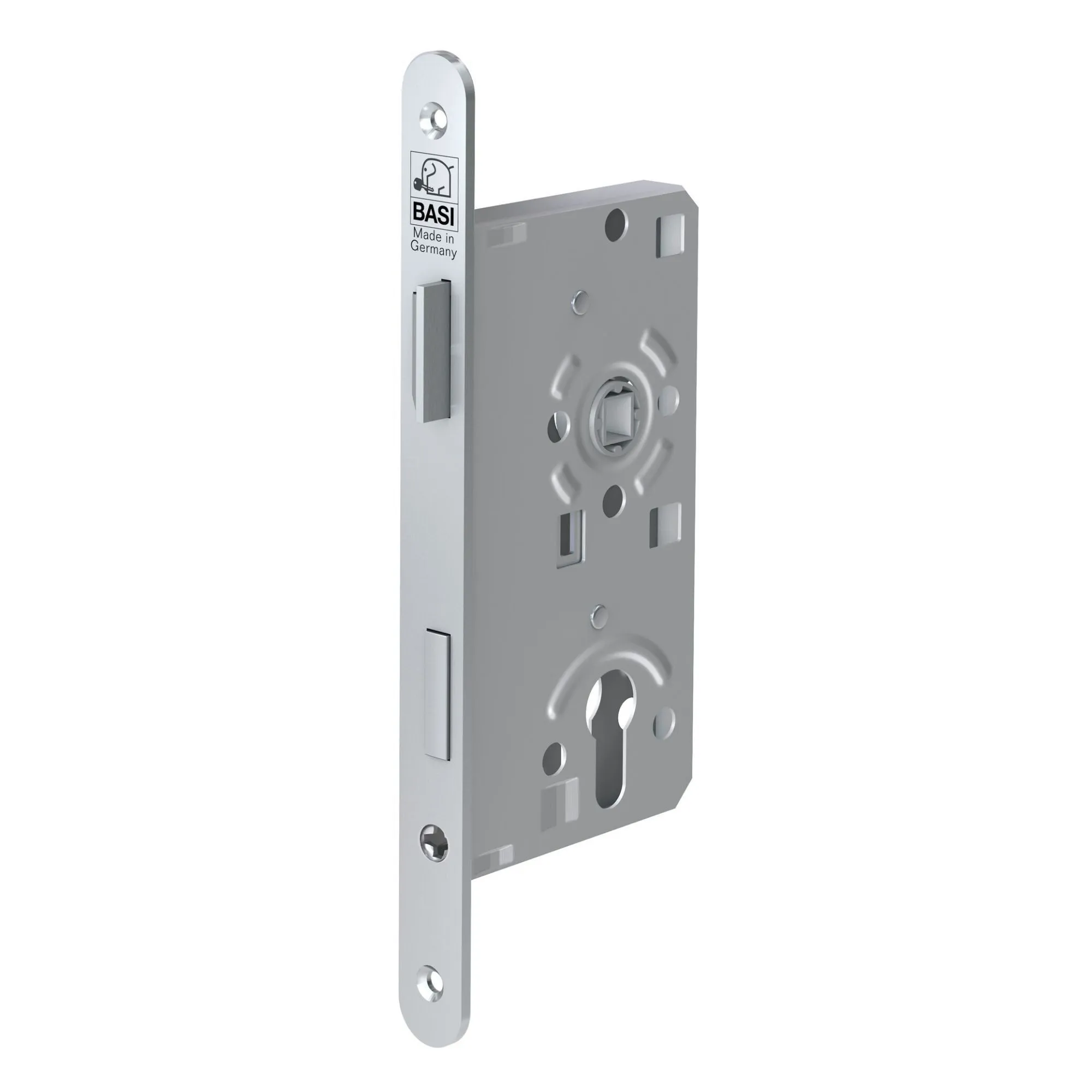 Das Einsteckschloss ES 929 ist für Eingangstüren und Zimmertüren ausgelegt und verfügt über eine Wechselfunktion. Es entspricht dem TGL-Maß und ist mit einer Profilzylinder-Lochung ausgestattet. Der Stulp ist abgerundet und nickel-silber lackiert, während Falle und Riegel aus Metall gefertigt sind. Die Maße des Schlosses umfassen ein Dornmaß von 55 mm, eine Entfernung von 72 mm sowie einen Vierkant von 8 mm.