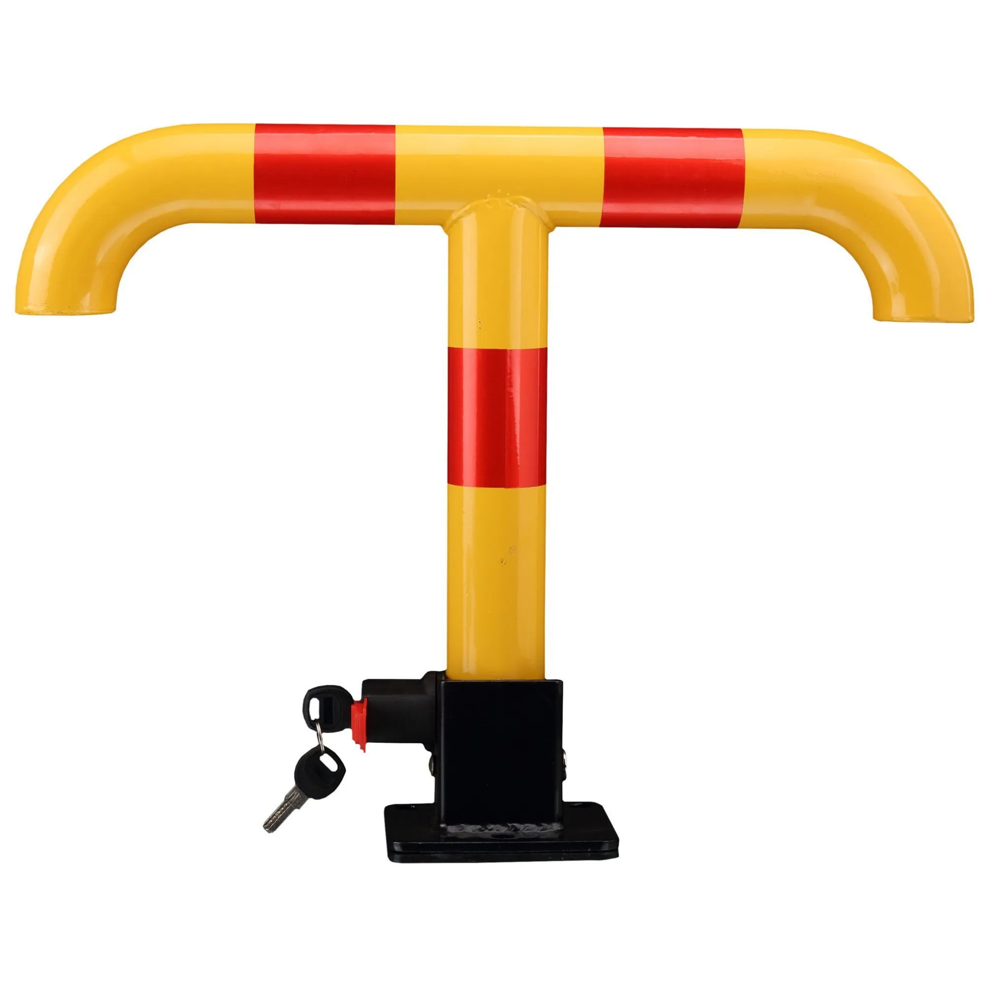 Der Absperrpfosten besteht aus robustem Stahl und ist in den Warnfarben Gelb und Rot gestaltet, wodurch er gut sichtbar ist. Er verfügt über eine umlegbare Funktion, die mittels der mitgelieferten zwei Schlüssel bedient wird. Die Montage erfolgt fest auf dem Boden, wobei der Pfosten mit einem Durchmesser von 60 mm, einer Höhe von 406 mm und einer Breite von 550 mm gefertigt ist.