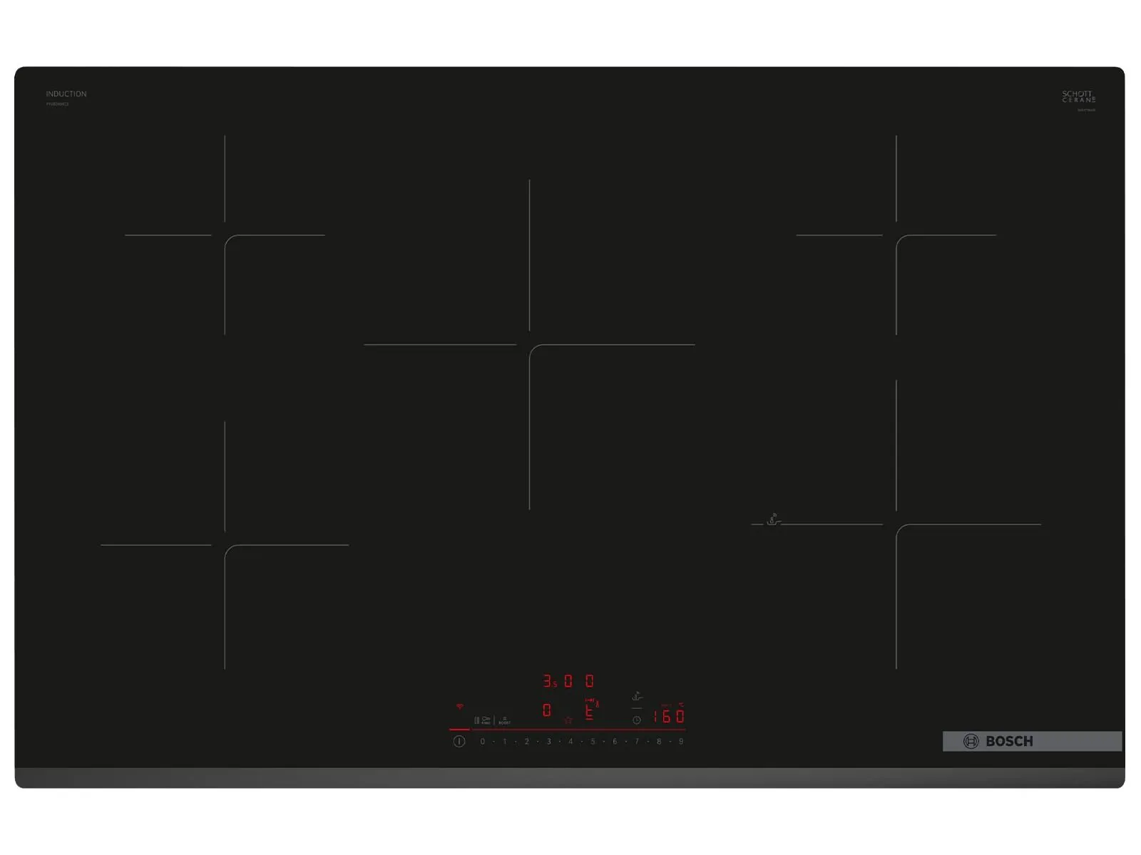 Das Induktions-Kochfeld bietet eine großzügige Breite von 80 cm und ermöglicht die Nutzung von fünf Kochzonen gleichzeitig. Die Kochzonen variieren in Größe und Leistung, um unterschiedliche Kochgeschirre optimal zu bedienen. Die Bedienung erfolgt über eine DirectSelect-Touch-Leiste mit 17 Leistungsstufen und zusätzlichen Funktionen wie PowerBoost, Timer mit Abschaltfunktion sowie einem Bratsensor mit 11 Temperaturstufen. Zusätzliche Features wie QuickStart, ReStart und eine Favoriten-Taste erhöhen die Benutzerfreundlichkeit und Effizienz des Kochfelds.