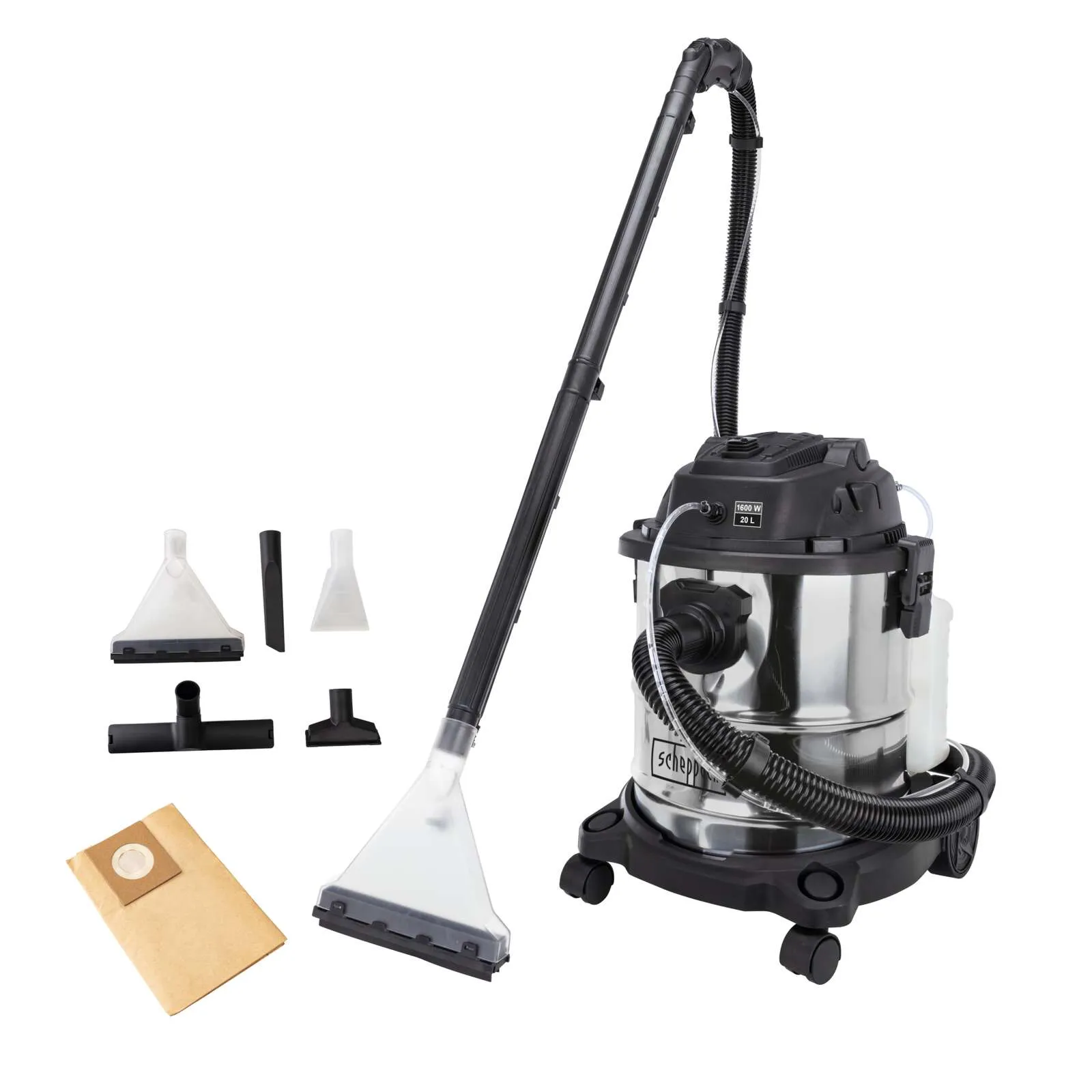 Der Sprüh- und Waschsauger verfügt über eine 5-in-1 Funktion, die Trockensaugen, Nasssaugen, Sprühen, Ausblasfunktion und Filterreinigung umfasst. Ausgestattet mit einem 20 Liter Schmutzwasserbehälter aus rostfreiem Stahl und einem abnehmbaren 3,5 Liter Wasser- und Reinigungsmitteltank bietet das Gerät eine praktische Handhabung. Der Sauger besitzt einen einklappbaren Tragegriff, vier leichtgängige Rollen sowie eine integrierte Kabel- und Zubehörhalterung. Im Lieferumfang sind diverse Düsen, Bürsten, Kunststoffrohre und Filter enthalten, die eine flexible Nutzung ermöglichen.