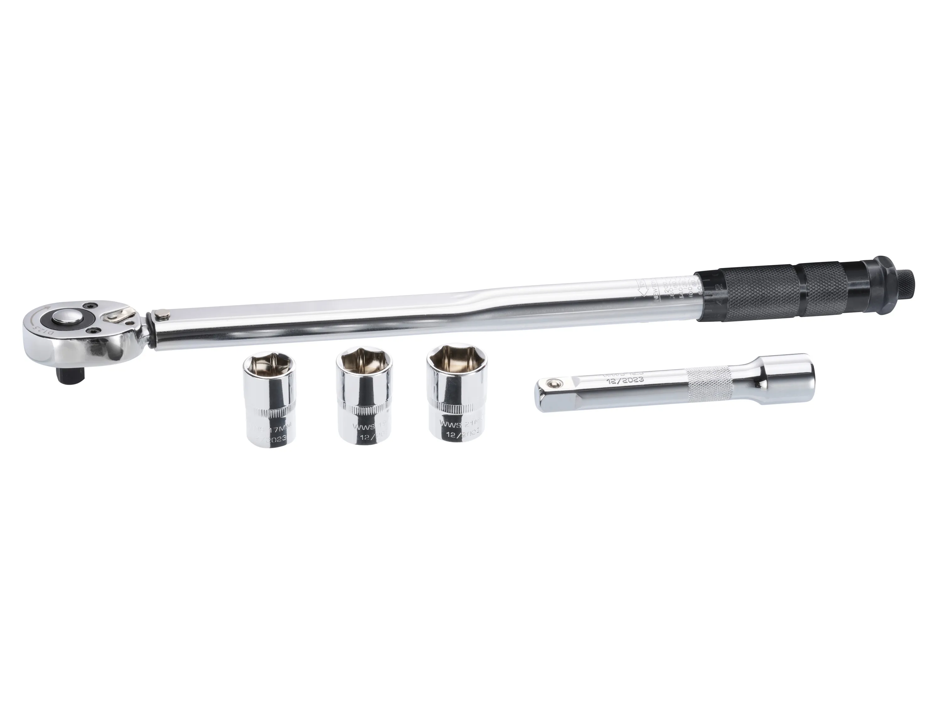Das 5-teilige Set umfasst einen Drehmomentschlüssel mit einstellbarem Drehmomentbereich von 40 bis 210 Nm. Es beinhaltet eine 125 mm Verlängerung sowie drei Stecknüsse in den Größen 17 mm, 19 mm und 21 mm. Die Werkzeuge sind aus Kohlenstoffstahl gefertigt und werden in einer praktischen Aufbewahrungsbox geliefert. Die Verbindung erfolgt über einen 1/2" Vierkant mit Schnellauswurf, was eine einfache Handhabung ermöglicht.