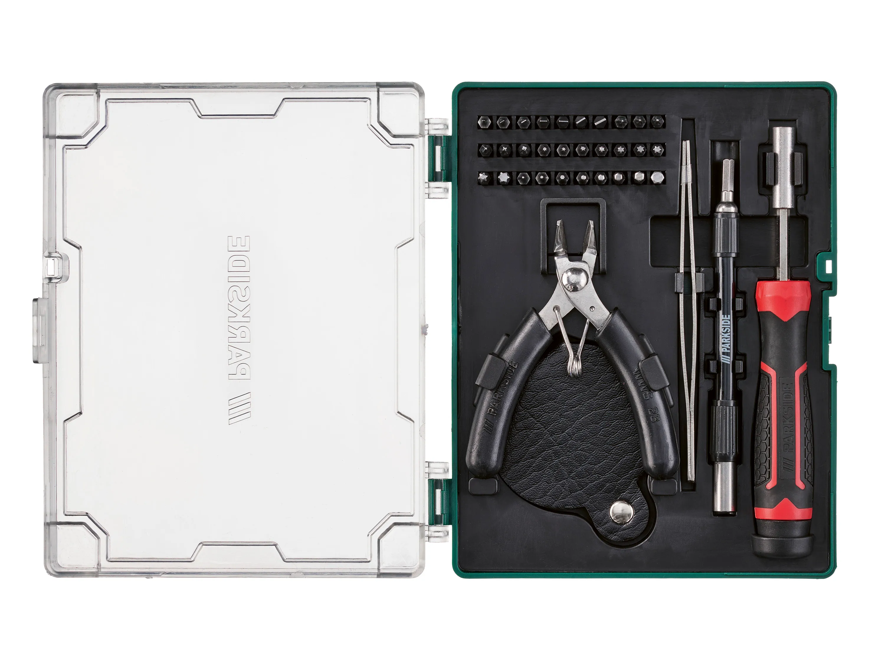 Der Feinmechanikersatz umfasst 35 Teile und wird in einer praktischen Kunststoffbox mit Schiebeverschluss geliefert. Das Set beinhaltet 30 Präzisions-Bits verschiedener Typen und Größen, einen Schraubendreher mit magnetischem Sechskant-Bithalter, ein flexibles Verlängerungsstück, eine Lupe mit 2,5-facher Vergrößerung, einen Mini-Seitenschneider sowie eine Pinzette. Die Werkzeuge bestehen aus Edelstahl, Karbonstahl, Glas, Kunststoff und Kunstleder. Die einzelnen Komponenten sind kompakt dimensioniert und ermöglichen präzises Arbeiten in feinmechanischen Anwendungen. Das Gesamtgewicht beträgt etwa 380 Gramm.