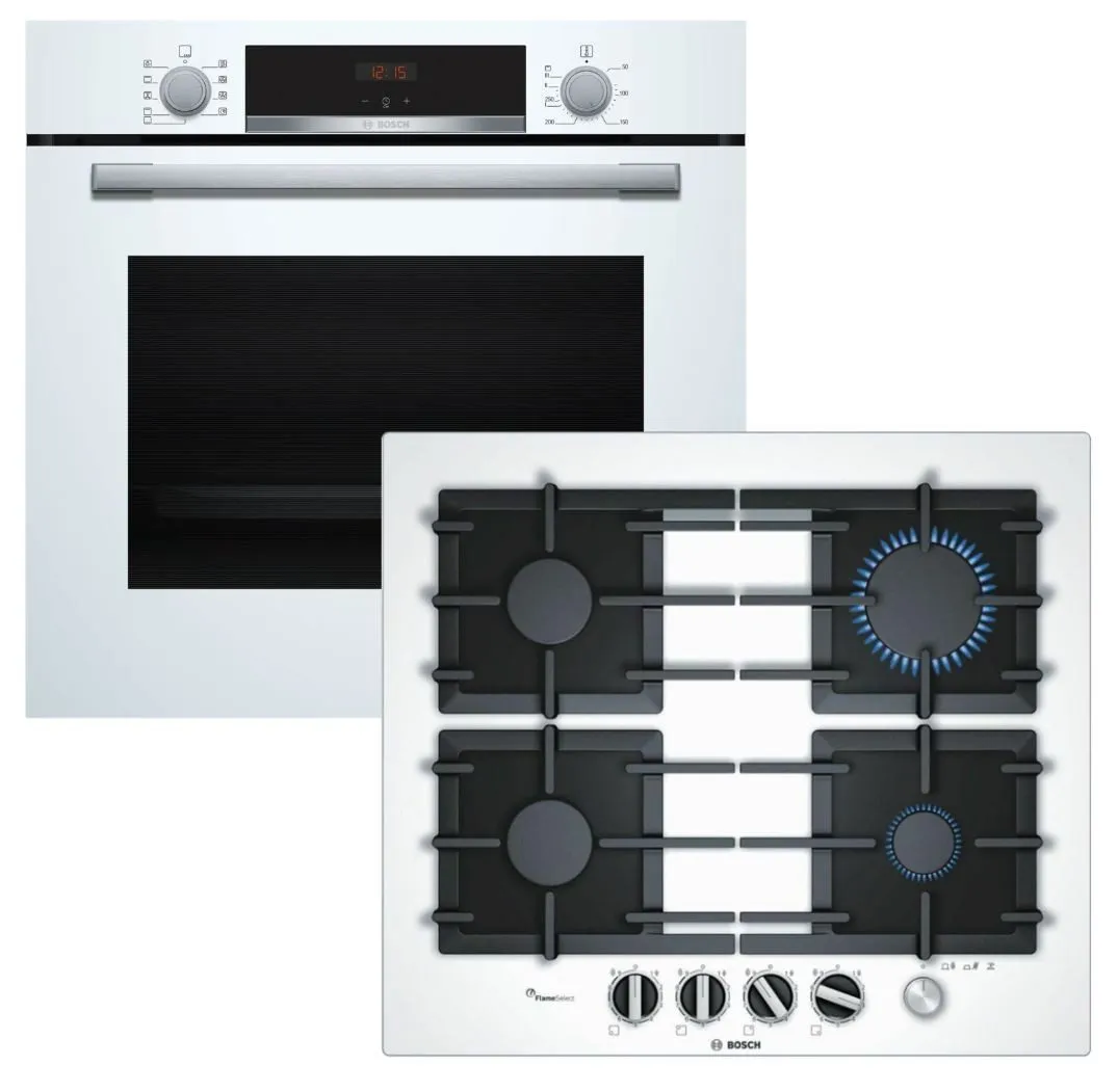 Das Herdset umfasst einen weißen BOSCH Einbau-Backofen mit 3D-Heißluft-Technologie, die gleichzeitiges Backen auf drei Ebenen ermöglicht. Der Backofen verfügt über eine Hydrolyse-Selbstreinigung, EcoClean Direct Beschichtung und eine Schnellaufheizfunktion. Zusätzlich ist ein Gaskochfeld der Serie 6 mit vier stufenlos regelbaren Gas-Kochstellen und einem robusten Gusseisenrost enthalten. Beide Geräte sind mit Kindersicherung ausgestattet und bieten eine moderne, energieeffiziente Ausstattung.