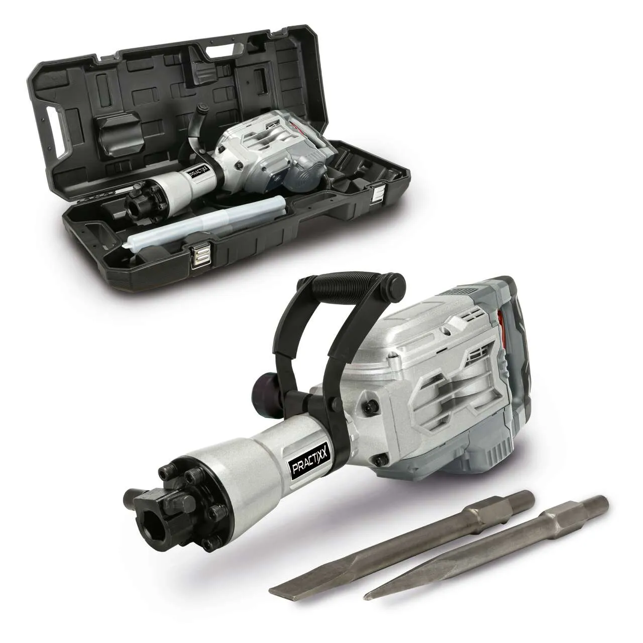 Der Abbruchhammer verfügt über ein robustes Gehäuse und zwei Handgriffe mit Soft-Grip für eine sichere Handhabung. Der hintere D-Handgriff sowie ein verstellbarer vorderer Handgriff mit Feststellschraube ermöglichen eine ergonomische Haltung bei der Arbeit. Zur Ausstattung gehören eine Schnellspann-Werkzeugaufnahme, ein Kunststoffkoffer mit Rollen sowie jeweils ein Spitz- und ein Flachmeißel mit 410 mm Länge; alle Komponenten sind auf einfachen Werkzeugwechsel und transportfreundliche Aufbewahrung ausgelegt.