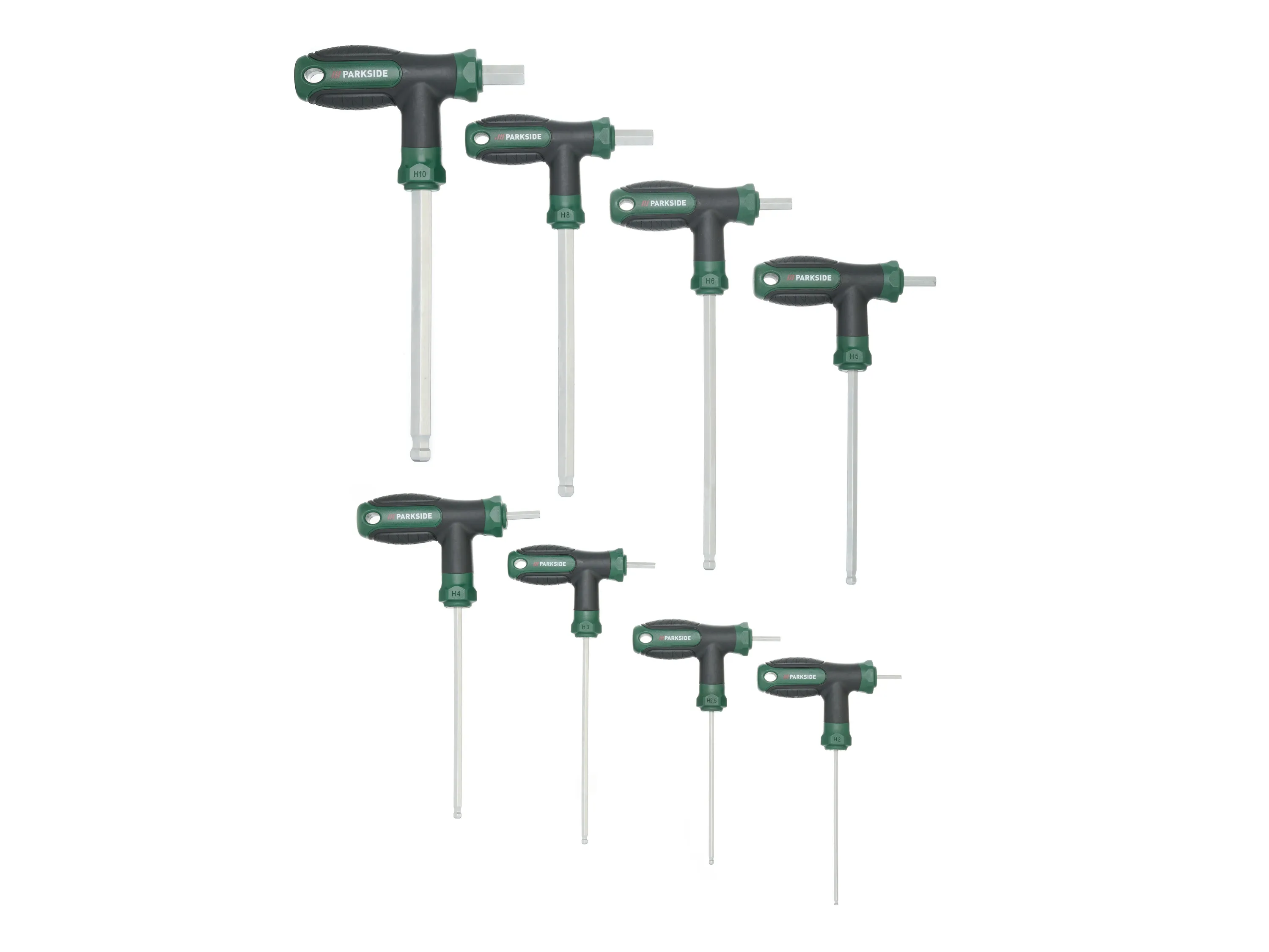 Der Satz umfasst ergonomisch geformte T-Griffe mit Stiftschlüsseln aus Stahl und Griffen aus Kunststoff. Jeder Schlüssel verfügt über einen definierten kurzen und langen Schaft sowie Griffmaße, die für unterschiedliche Schlüsselgrößen variieren. Geliefert werden sowohl Innensechskant- als auch Innensechsrund-Ausführungen mit jeweils acht Schlüsselgrößen, die in verschiedenen Längen verfügbar sind. Die Griffe sind so gestaltet, dass eine hohe Kraftübertragung möglich ist, und die unterschiedlichen Griffgrößen bieten variierende Hebelwirkung. Materialangaben und Gewichtsangaben sind für die beiden Sätze separat aufgeführt.