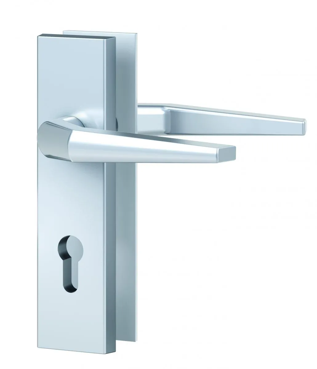 Der Schutzbeschlag besteht aus Vollmaterial Aluminium mit einer eloxierten Oberfläche in Alu Silber und verfügt über ein eckiges Kurzschild. Die Garnitur ist für Profilzylinder ausgelegt und weist einen einstellbaren Zylinderüberstand von 10 bis 17 mm auf; die sichtbare Verschraubung ist innen angebracht. Die Ausführung enthält einen Vierkantstift mit den Maßen 72 x 12 x 8 mm und ist für Türstärken im Bereich 38 bis 42 mm konzipiert. Die Verarbeitung zeigt klare Kanten und eine robuste Bauweise; der Lieferumfang umfasst den beschriebenen Vollmaterial-Schutzbeschlag.