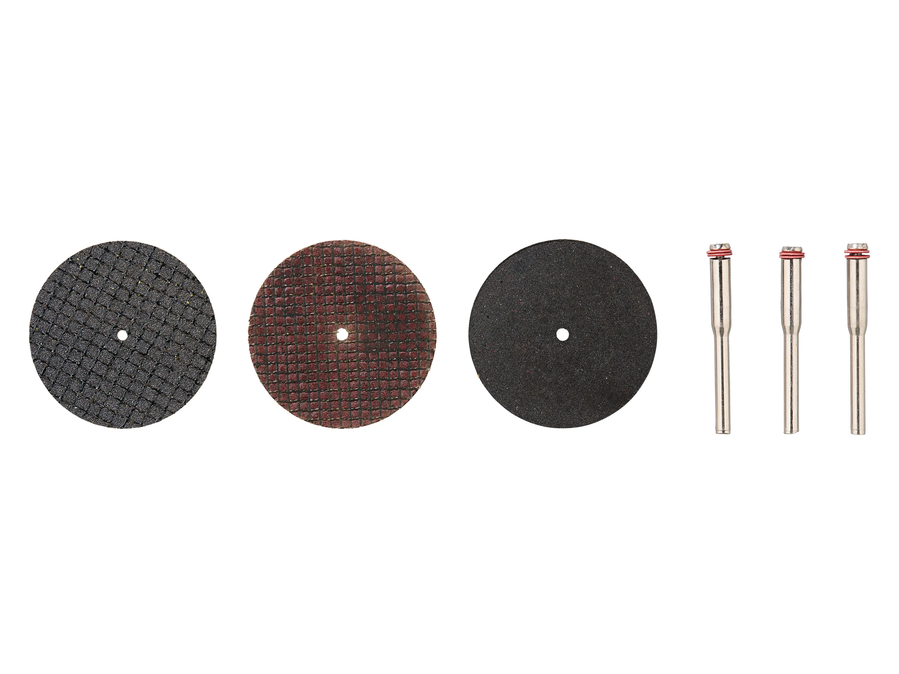 Das Zubehörset umfasst mehrere separat zusammenstellbare Sets für Geradschleifer mit Rundschaftaufnahme und bietet eine Auswahl an Bürsten, Scheiben, Stiften, Fräsern und Lamellenschleifern. Die einzelnen Komponenten bestehen überwiegend aus Stahl sowie ergänzenden Materialien wie Kunststoff und Papier; eine Tube Polierpaste ist ebenfalls enthalten. Die Ausführung der Teile variiert in Form und Abmessung und ermöglicht Arbeiten an Metall, Holz und Kunststoff. Hinweise zur maximalen Drehzahl und zur Sichtprüfung vor dem Einsatz sind Bestandteil der Produktinformationen. Verpackungsinhalte und Gewichte der einzelnen Sets sind differenziert ausgewiesen.