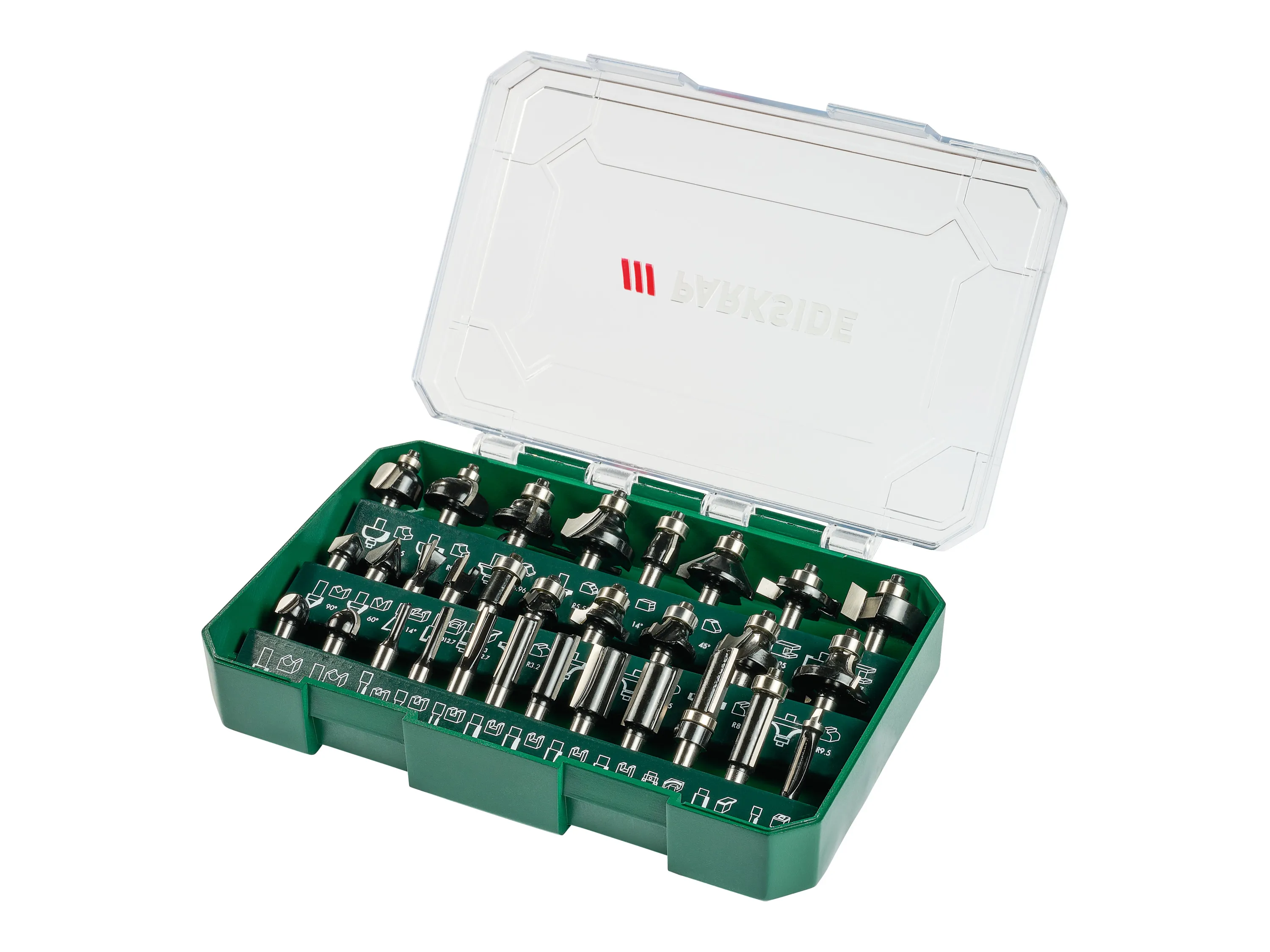 Das Set besteht aus 30 Fräserbits mit langlebiger Hartmetallschneide und einer Mischung verschiedener Profiltypen in einer kompakten Aufbewahrungsbox. 16 der Fräser sind mit einem kugelgelagerten Anlaufring ausgestattet, wodurch sich genaue Führungseigenschaften ergeben; zusätzlich werden ein Innensechskantschlüssel und eine sortierte Einlage geliefert. Die Ausführungen umfassen Abrund-, Nut-, Bündig-, Hohlkehl-, Kehl-, Scheiben-, Fase-, Zinken- und Profilfräser sowie spezielle Profil- und Rillenfräser. Gehäuse und Box sind aus Kunststoff gefertigt, die Fräser aus Stahl; das Set ist mit einem Schaftmaß von 8 mm spezifiziert und weist ein Gesamtgewicht von etwa 1,3 kg auf.