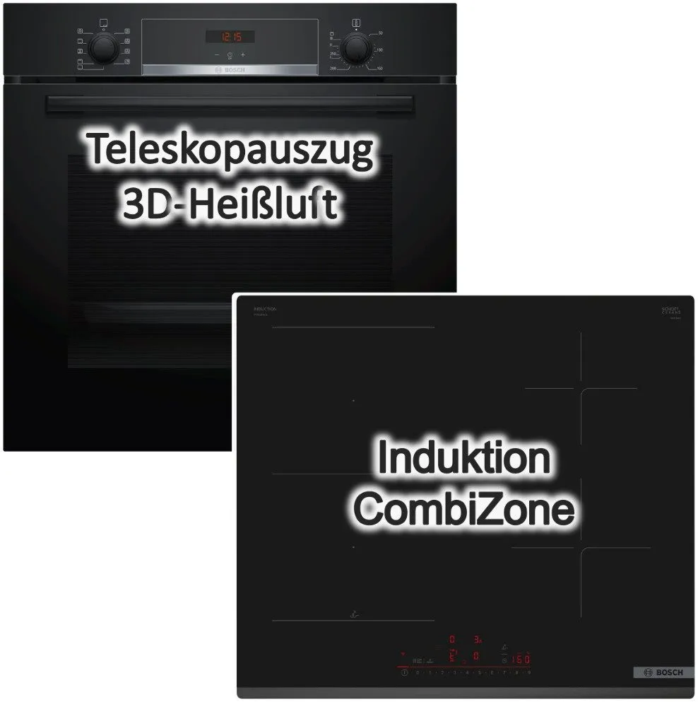 Das Set besteht aus einem Einbau-Backofen mit Hydrolyse-Reinigung, EcoClean-Beschichtung und Teleskopauszug sowie einem autarken Induktionskochfeld mit DirectSelect-Bedienung. Der Backofen verfügt über sieben Beheizungsarten einschließlich 3D Heißluft, Pizzafunktion und Umluftgrill, eine 3-fach vollverglaste Tür, CoolDoor-Technologie sowie eine Halogen-Innenbeleuchtung. Das Induktionskochfeld bietet vier Kochzonen (darunter eine CombiZone), PowerBoost- und PanBoost-Funktionen, HomeConnect-Unterstützung sowie eine umfangreiche Sicherheitsausstattung. Lieferumfang des Backofens umfasst Kombirost, Universal-Backblech aus Emaille und einen 1-fach Teleskopauszug. Technische Maße, Anschlusswerte und Energiekennwerte sind für Einbau und Anschluss angegeben.