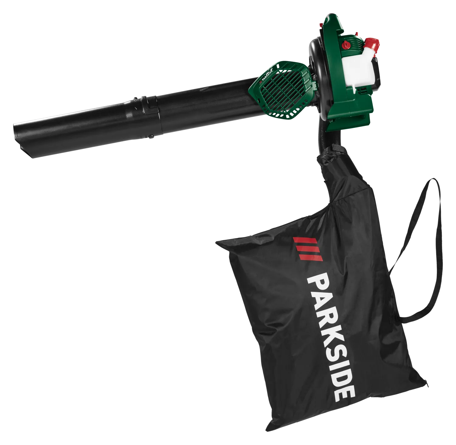 Das Gerät ist als Kombigerät mit Saug-, Blas- und integrierter Häckselfunktion ausgeführt und verfügt über ein leichtes Kunststoffgehäuse sowie einen längenverstellbaren Tragegurt am Fangsack. Der luftgekühlte 2‑Takt-Motor arbeitet mit manueller Kraftstoffpumpe und wartungsfreier elektronischer Zündung; Start erfolgt über Seilzug. Die Bedienung ermöglicht stufenlose Drehzahlregelung über einen Wahlhebel, wodurch zwischen Saugen und Blasen schnell gewechselt werden kann. Das Häckselwerk mit Metallmessern reduziert das Laubvolumen bis zu einem Verhältnis von 10:1. Zum Lieferumfang gehören eine Kraftstoff-Mischflasche, ein Multifunktionsschlüssel sowie ein Innensechskantschlüssel mit Kreuzschlitz-Schraubendreher. Hinweise zur Nutzung und Ausschlüsse sind in der Produktbeschreibung angegeben.