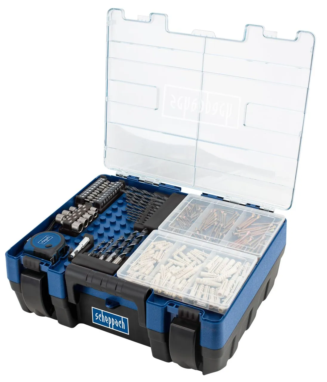 Die mobile Werkstatt umfasst eine Akku-Schlagbormaschine der Pro Series sowie eine robuste Werkzeugbox mit organisiertem Innenraum. Im Lieferumfang sind zwei Akkus mit je 2,0 Ah Kapazität, ein Schnellladegerät und ein umfangreiches Zubehörset mit 206 Teilen enthalten. Die Maschine ist als 20V-Ausführung beschrieben und trägt die Modellkennung CCD45-20ProS. Die Werkzeugbox ist kompakt ausgeführt und verfügt über die angegebenen Außenmaße, sodass Transport und Lagerung vereinfacht werden.