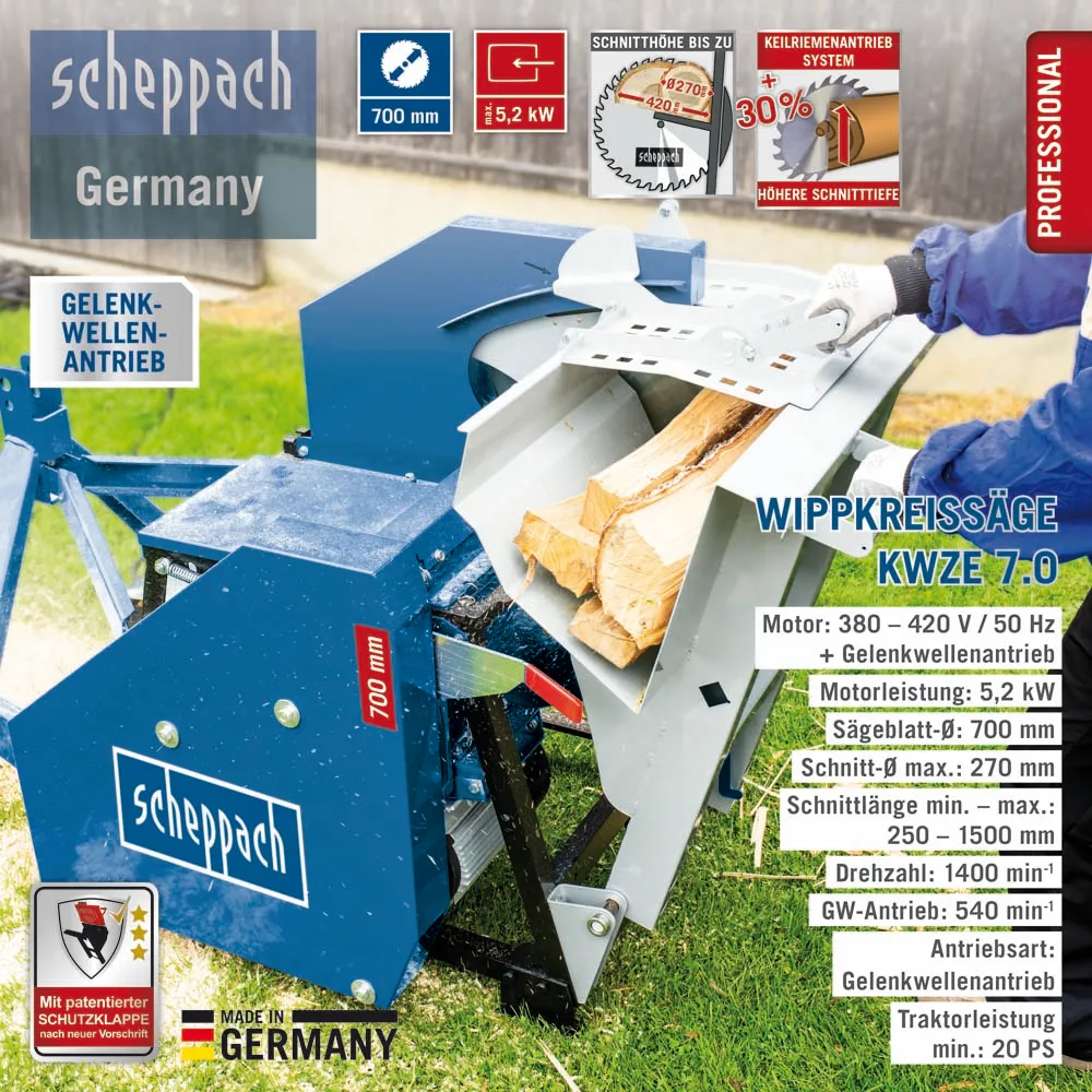 Das Gerät ist mit einem unten eingebauten Motor und einem Keilriemenantrieb ausgestattet. Ein 700 mm Sägeblatt ermöglicht große Schnitttiefen, die Wippenverlängerung verfügt über eine Schnittlängen-Anzeige. Die Konstruktion umfasst einen Gelenkwellenantrieb sowie eine Dreipunktaufhängung und ein stabiles, geschweißtes Winkeleisengestell. Die Ausführung ist auf robusten, kraftvollen Betrieb ausgelegt und bietet ergonomische Merkmale wie einen idealen Wippendrehpunkt zur kraftsparenden Bedienung. Geliefert wird das Produkt einsatzbereit montiert.