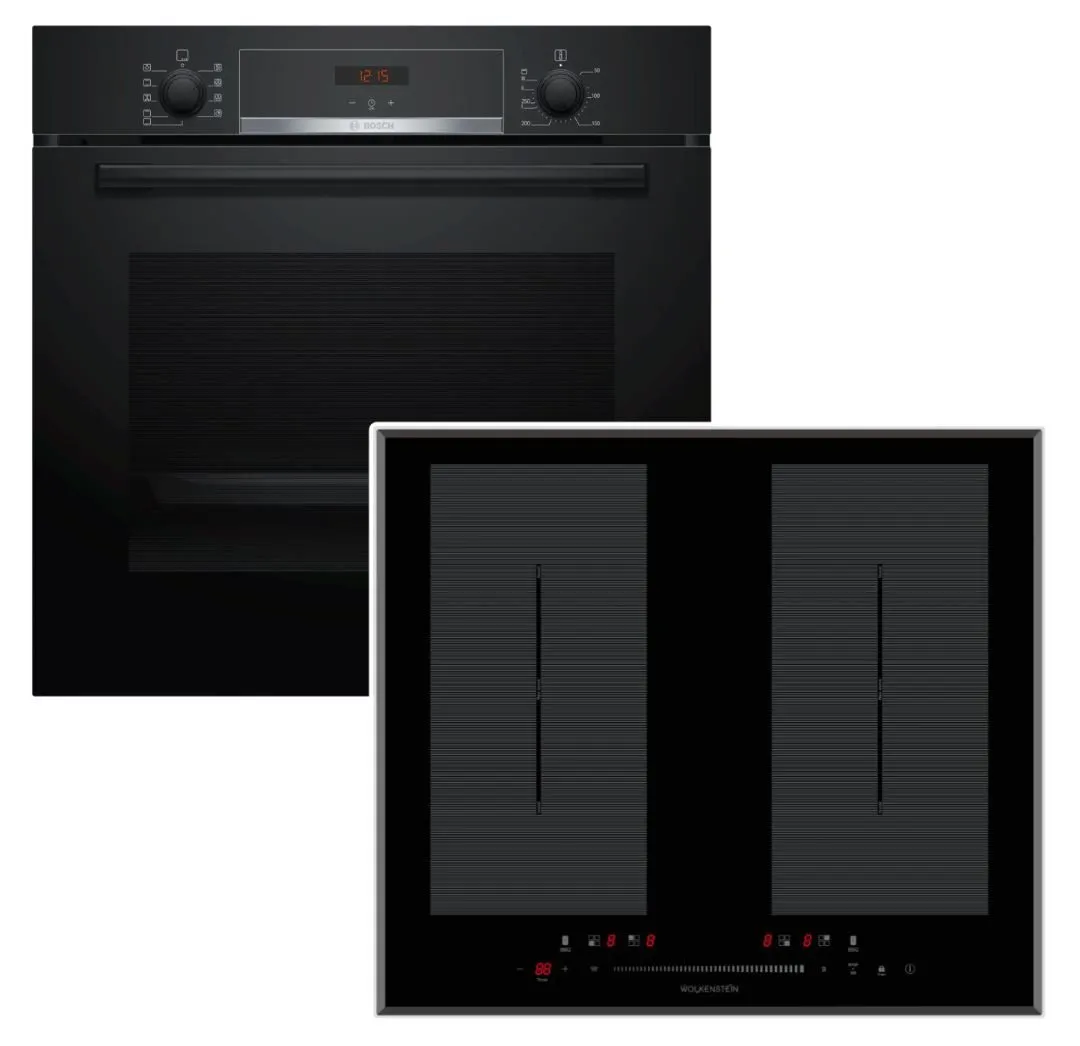 Das Set besteht aus einem Einbau-Backofen mit EcoClean-Funktion und Teleskopauszug sowie einem autarken Induktionskochfeld mit Booster und Doppel-Flexzonen. Der Backofen verfügt über 71 Liter Garraum, sieben Beheizungsarten einschließlich 3D-Heißluft und Pizzafunktion, Hydrolyse-Reinigungsfunktion sowie eine CoolDoor-Verglasung und Kindersicherung. Das Kochfeld ist aus Glaskeramik gefertigt, verfügt über vier Kochzonen (davon zwei Doppel-Flexzonen), eine Booster-Funktion, automatische Topferkennung, Stop-&-Go-Funktion sowie Sensor-Touch-Bedienung. Beide Geräte weisen detaillierte Einbau- und Verpackungsmaße auf und werden mit den genannten Zubehörteilen geliefert.