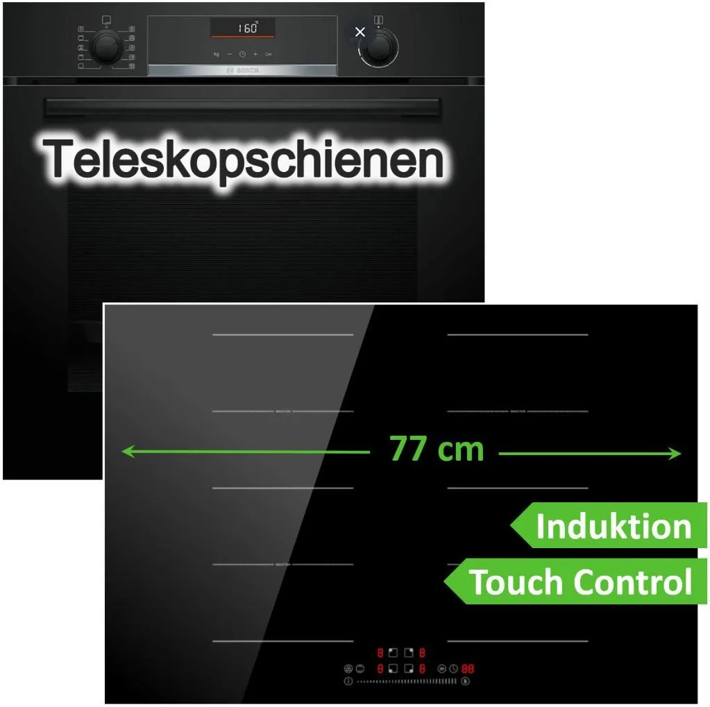 Das Set umfasst einen Einbau-Multifunktionsofen mit 71 Liter Nutzvolumen und ein Induktionskochfeld mit zwei Flexzonen. Der Backofen bietet 3D-Heißluft, zahlreiche Heizarten einschließlich Grill und Pizza-Stufe sowie eine hydrolytische Reinigungsfunktion. Die Tür verfügt über einen SoftClose-Mechanismus und eine 3-fach verglaste Ausführung, ergänzt durch tangentiales Kühlgebläse und integrierte Kindersicherung. Das Kochfeld ist mit PowerBoost, automatischer Topferkennung, Restwärmeanzeige, Abschaltautomatik und Touch-Control ausgestattet. Ein Teleskopauszug auf Führungsschienen ist im Lieferumfang enthalten und die Einbaumaße entsprechen gängigen Nischenmaßen.