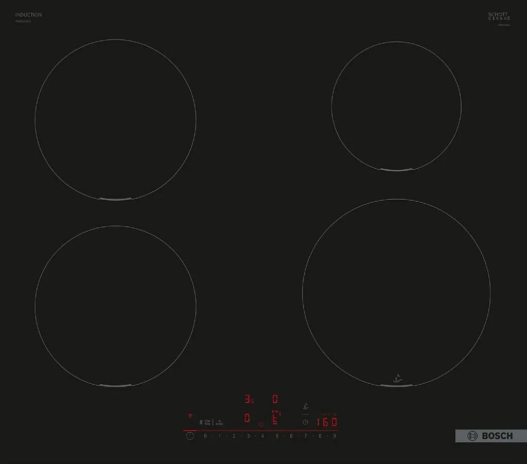 Das Induktionskochfeld bietet eine rahmenlose Ausführung aus schwarzer Glaskeramik mit modernen Bedienfunktionen. Es ist mit vier Kochzonen ausgestattet, die unterschiedliche Durchmesser und Maximalleistungen aufweisen, sowie einer DirectSelect-Steuerung und neun Leistungsstufen. Zu den integrierten Funktionen zählen Home Connect, PowerBoost, PanBoost, PerfectFry-Bratsensor, ReStart, QuickStart, Timerfunktionen, Kindersicherung, Pause-Funktion, Warmhaltefunktion und eine individuelle Sicherheitsabschaltung. Die technischen Einbaumaße, die Leistung sowie die elektrischen Anschlussdaten sind für die fachgerechte Installation angegeben.