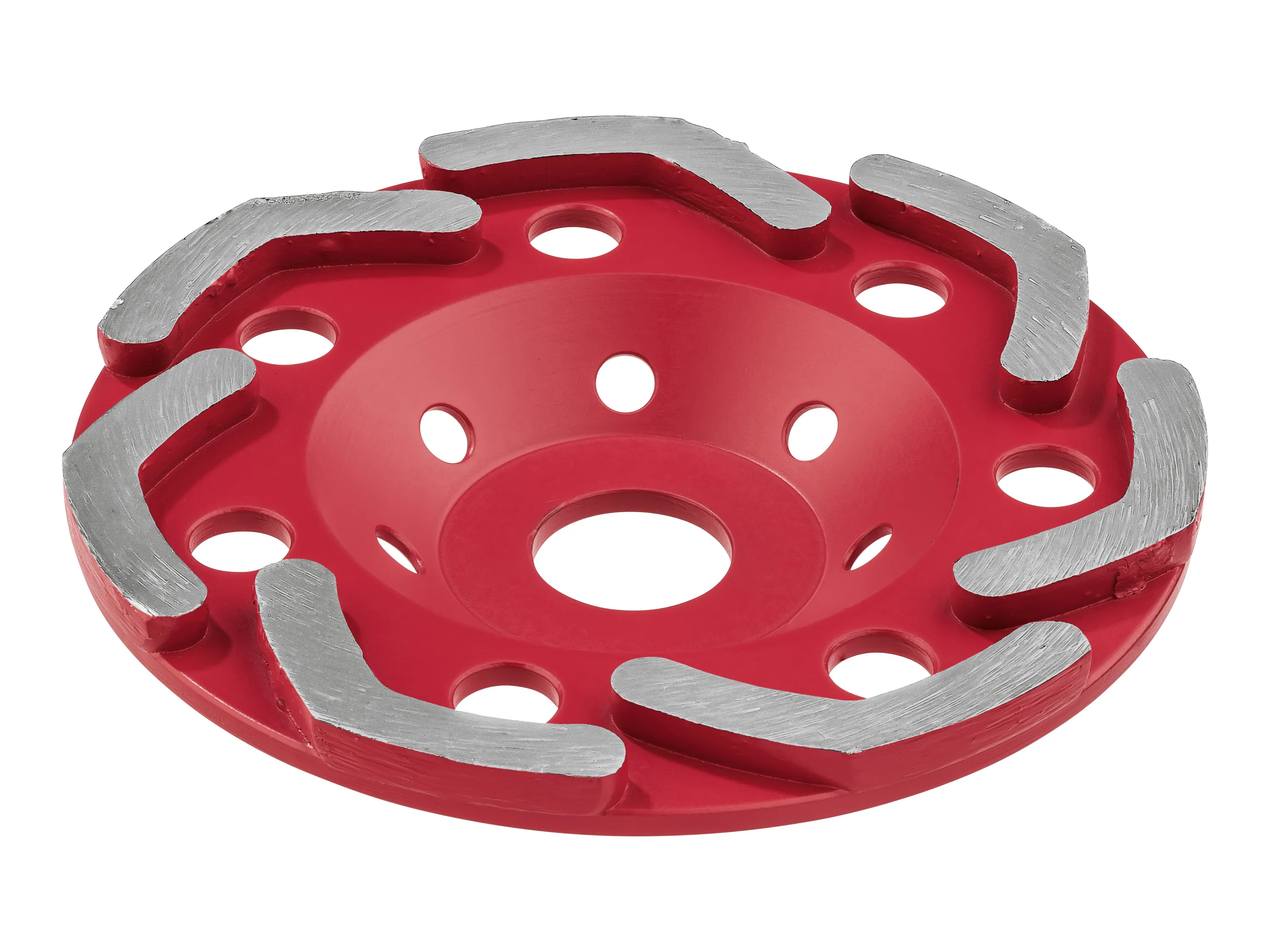 Die Diamant-Schleiftopf-Ausführung bietet eine robuste Kombination aus Stahl und diamantbestückter Schleifkante. Die Scheibe ist gelocht ausgeführt und kann mit Absaughauben zur Staubreduzierung verwendet werden. Zwei Zahnungsvarianten sind vorhanden: eine Doppelreihe für hohe Abtragsfläche und eine Extra-Speed-Anordnung für erhöhte Schleifgeschwindigkeit auf Beton. Die Bauweise und Bohrung sind auf gängige Winkelschleifer ausgelegt, die Maße und Gewichte der Varianten sind differenziert angegeben. Verarbeitung und Materialwahl sind auf den Einsatz an harten Baustoffen abgestimmt.