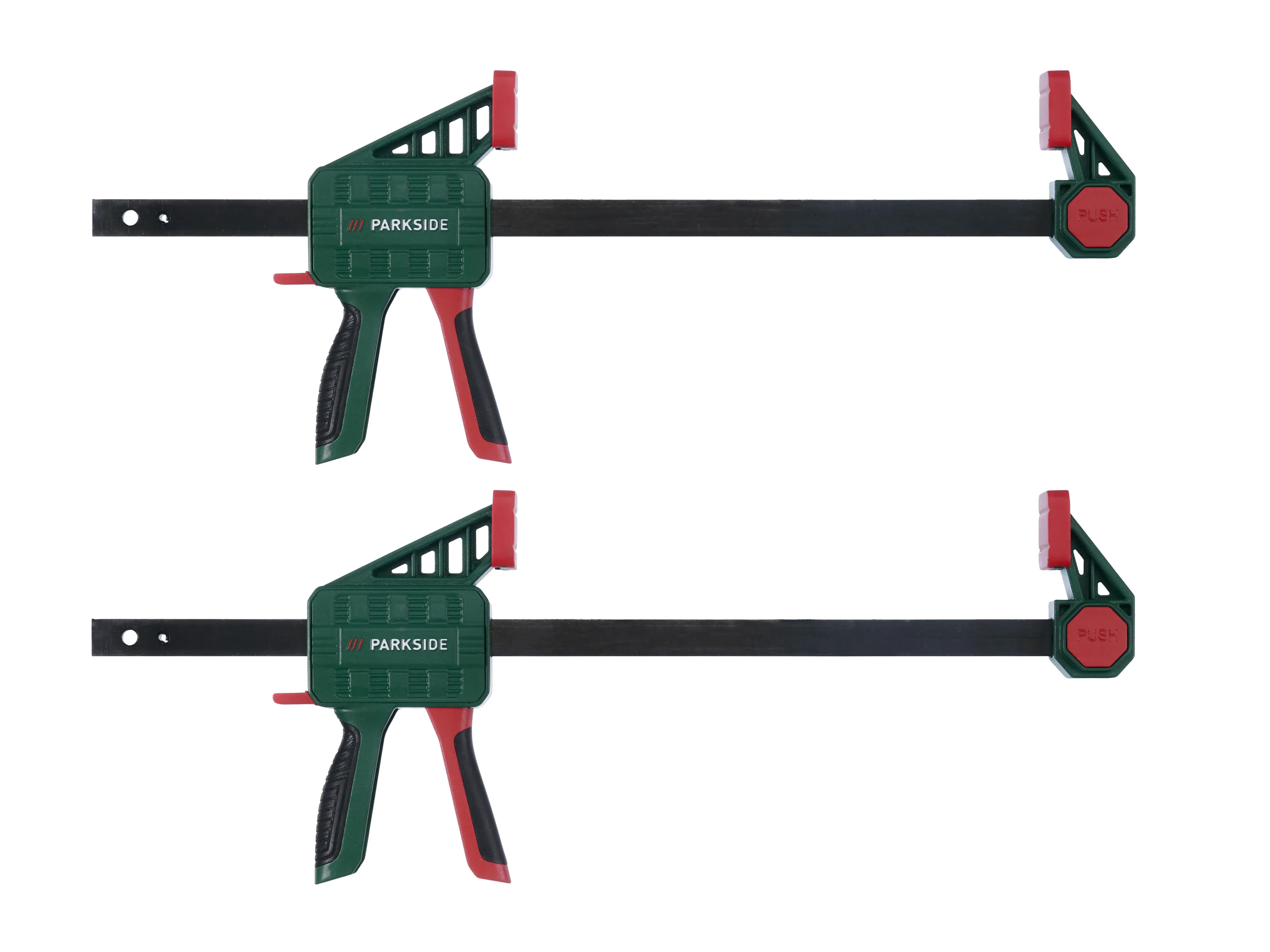 Die Schnellspannzwingen in Größe L sind als einhändige Spannvorrichtung mit ergonomischen Griffen und Schnellentriegelung ausgeführt. Die Spannbacken bestehen aus Kunststoff und schonen die Werkstücke, während die Schiene aus robustem Stahl gefertigt ist. Der Umbau zur Spreizfunktion ist werkzeuglos möglich, indem der Feststeller gelöst und die Spannbacke versetzt wird. Bedienung erfolgt über Hebelbetätigung zum schnellen Festspannen und einen Knopf zum Lösen. Das Lieferumfangsformat bietet zwei Zwingen und umfasst Schienen- und Zwingenmaße sowie das Gesamtgewicht.