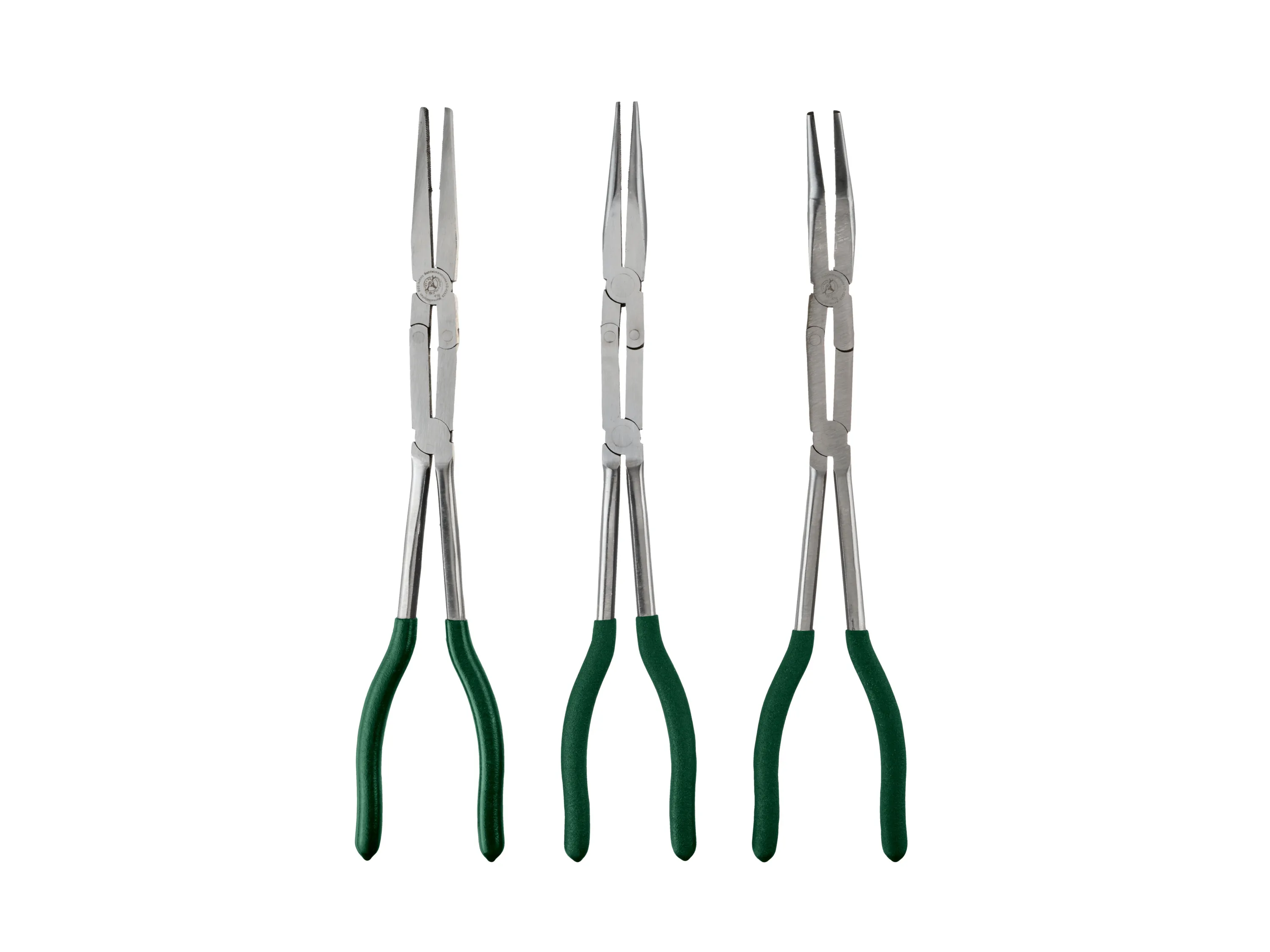 Das Set besteht aus einer Auswahl langer und standardlanger Zangen in verschiedenen Ausführungen und wird mit einer Aufbewahrungstasche geliefert. Die Griffe sind mit rutschhemmender 2-Komponenten-Beschichtung ausgeführt, die Handhabung ist auf Komfort und Griffsicherheit ausgelegt. Die Zangen sind aus Karbonstahl gefertigt und verfügen über Kunststoffkomponenten; das Langbeckzangen-Set umfasst gerade, um 20°, 5° und 90° abgewinkelte Spitzen sowie eine Ringspitze. Das zusätzliche Zangen-Set enthält Spitzzangen und eine Flachzange in gerader und 45°-abgewinkelter Ausführung. Abmessungen und Gewichtsangaben sind pro Ausführung angegeben, Lieferung umfasst alle genannten Elemente in der Tasche.