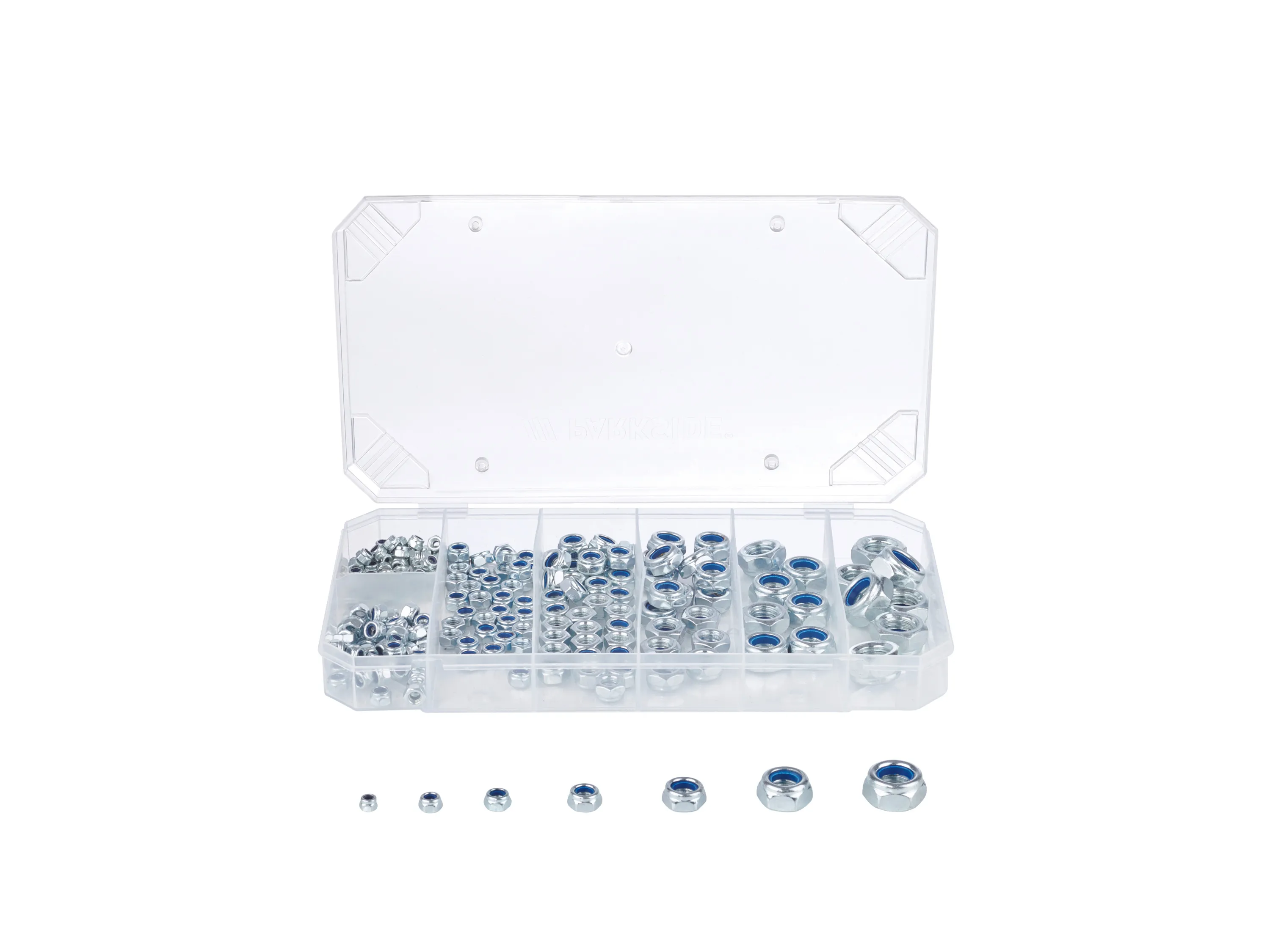 Das Sortiment enthält verschiedene Muttern- und Hülsenschrauben-Typen in einem kompakten Set. Geliefert werden Einschlagmuttern, Einschraubmuttern, Hülsenschrauben, Anschlagmuttern und Flanschmuttern in definierten Stückzahlen und Gewindegrößen. Die Teile bestehen aus Stahl und Kunststoff und sind nach Gewindegrößen sortiert, dabei sind sowohl Innensechskant- als auch Kreuzschlitz-Antriebe vorhanden. Angaben zu Schraubenlängen und Stückzahlen für die einzelnen Größen sind im Lieferumfang enthalten. Die Verpackung fasst die Komponenten übersichtlich zusammen und erleichtert die Entnahme einzelner Teile.