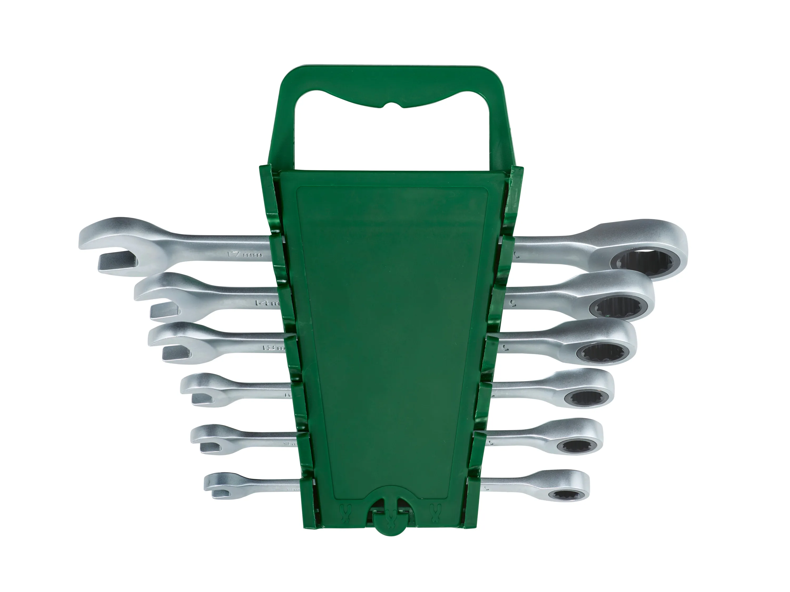 Der Satz besteht aus Gabel- und Ratschen-Ringschlüsseln in verschiedenen Ausführungen und wird im praktischen Kunststoffhalter geliefert. Die Werkzeuge sind aus Stahl gefertigt und nickelbeschichtet, wobei die Ratschen über 90 Zähne verfügen und teils mit Umschaltung ausgestattet sind. Im Lieferumfang sind mehrere Schlüsselweiten enthalten, die jeweiligen Längen und Gewichte der einzelnen Ausführungen sind angegeben, und eine Wandmontage des Halters ist möglich. Die Verarbeitung ist auf robuste Nutzung ausgelegt und die einzelnen Schlüssel sind zur übersichtlichen Aufbewahrung im Halter fixierbar.