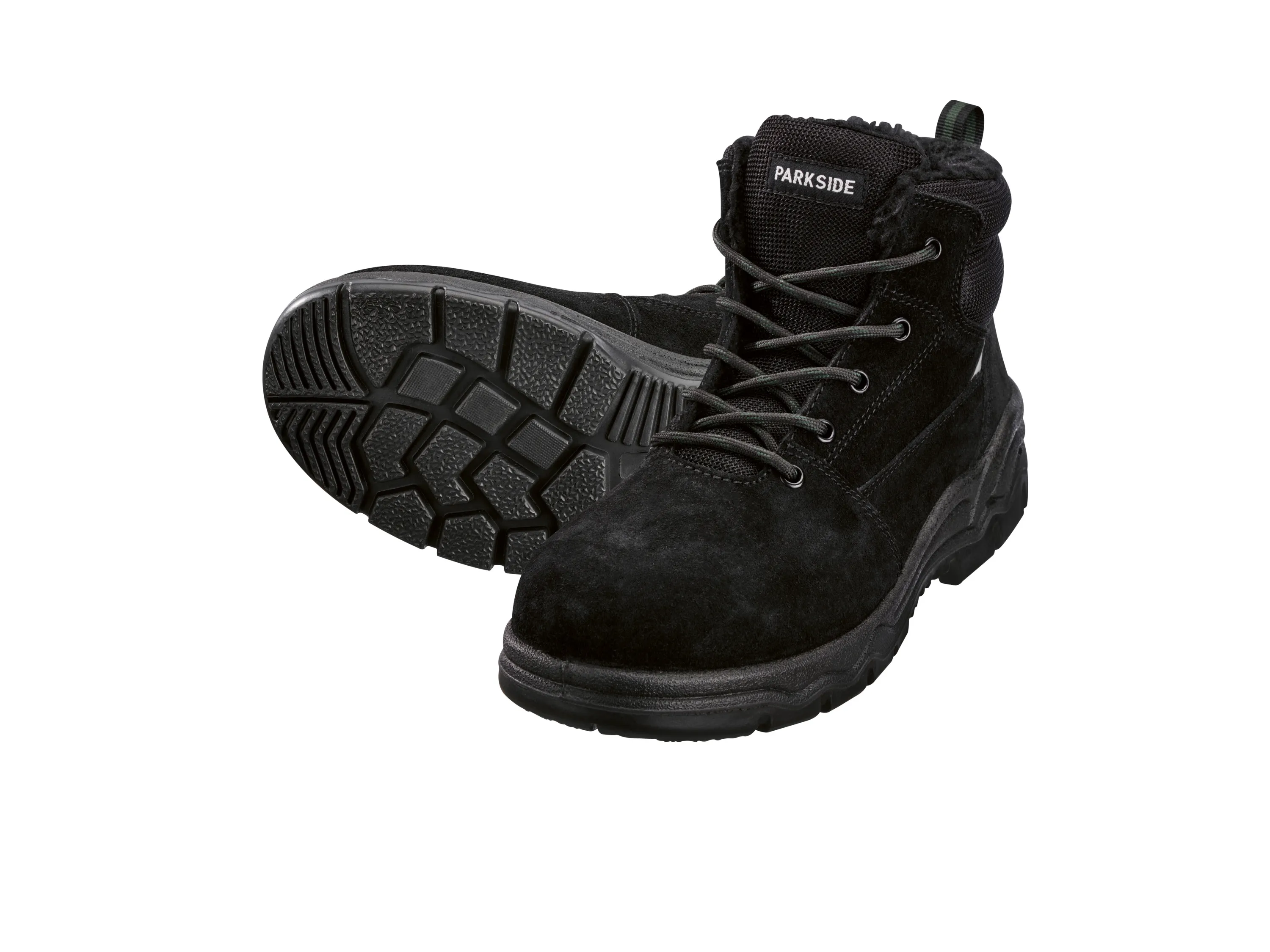 Die Ausführung besteht aus einer Kombination aus robustem Leder und textilem Obermaterial und verfügt über eine wärmende Innenfütterung. Schutzfunktionen umfassen eine Stahl-Zehenkappe, eine durchtrittsichere Zwischensohle sowie eine profilierte PU-Laufsohle mit rutschhemmendem Profil. Zusätzliche Details sind reflektierende Elemente aus 3M Scotchlite™ sowie eine textile Deck- und Futtersohle; die Lederherstellung ist gemäß Leather Working Group zertifiziert. Die Verarbeitung zeigt verstärkte Nähte und eine hochgezogene Schaftkonstruktion (High Cut) für erhöhte Stabilität und Standfestigkeit.